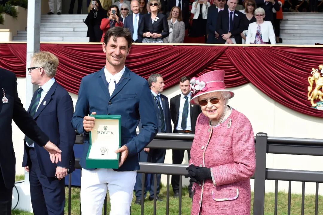 劳力士大奖赛冠军兼劳力士代言人史蒂夫·戈尔达 (Steve Guerdat) 与英国女王