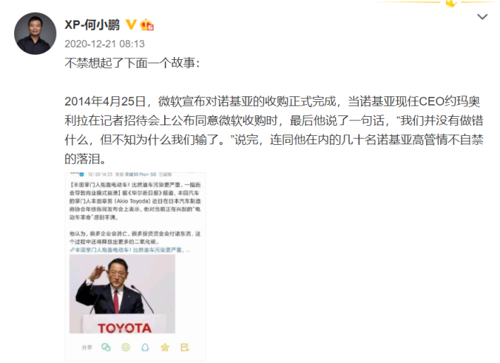 引发争议的新势力造车者还有何小鹏。本月,丰田章男称,纯电动车会带来更多污染,过早禁燃会造成电动车商业模式崩塌。何小鹏发微博,以诺基亚的例子暗讽丰田过于保守。然而,何小鹏所举的例子,却被网友指出是子虚乌有。也许何小鹏选错了批评的对象,但也可见他对新能源车产业环境的关切心情。