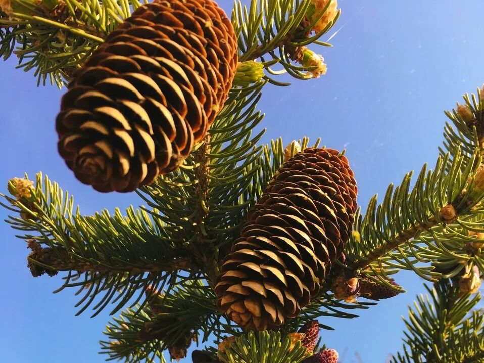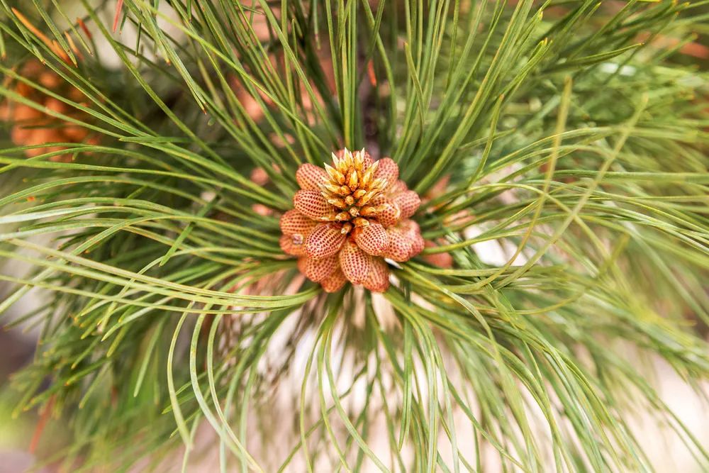 松树的针叶十分茂盛、四季常绿,很少有人会观察它开花,每种松树的花期也不同,雌雄花在一处,雌花在顶部、雄花在底部,授粉后雌花变成松塔,松塔由绿变黄,晴天张开,雨天合拢,松塔缝隙里,就是松子,成熟后可掉落。