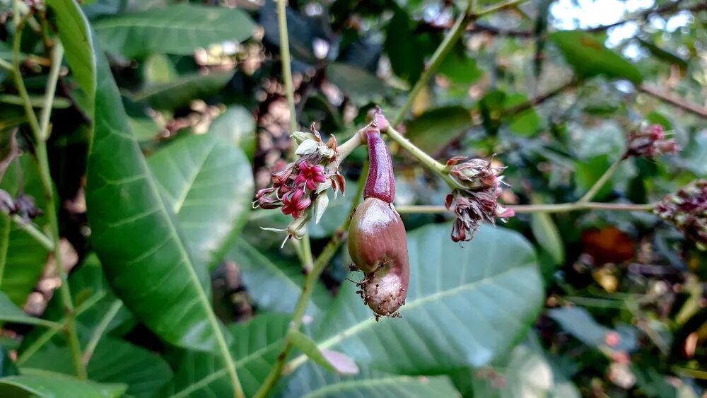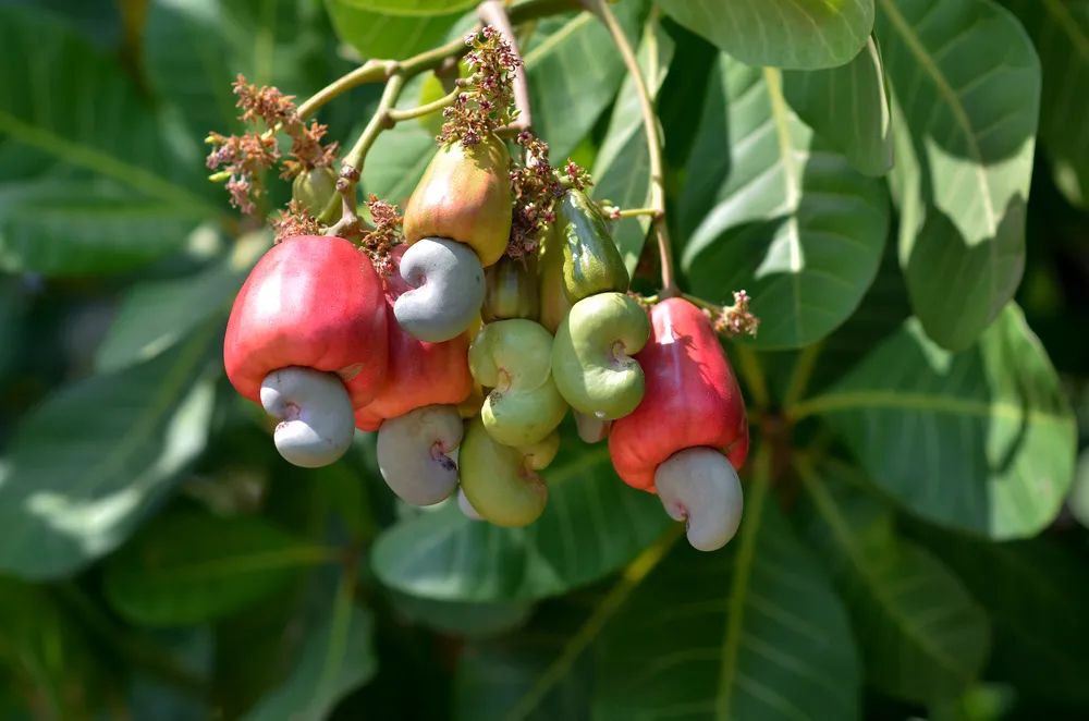 腰果树非常高大,能长到10米多高,种下后3年就能开花结果,腰果花数量很多,但结果率低一些,长出腰果后,底座逐渐膨大,变成一个混淆视线的假果,名为腰果梨,也可以当水果吃,等腰果梨变红色,就说明成熟。