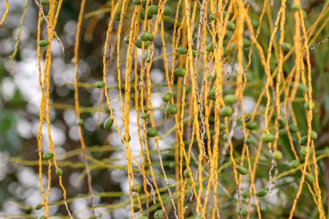 海枣椰春天3-4月开花,花序金黄色,上面有些小花蕊,授粉后慢慢有膨大的果实,由绿变红,变成红色、摸着有点发软时,就可以吃了,但最好是让它自然脱水,晾成枣椰干,吃起来更甜,口感更好~