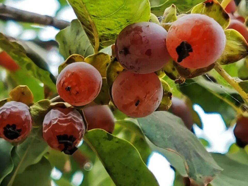 君迁子也是柿子的一种,以它的大小,只能算是迷你柿子,放在手心里跟个琉璃球似的,果实比较涩,就算变红了依然很酸涩,只能等它干瘪、变黑了才能吃。