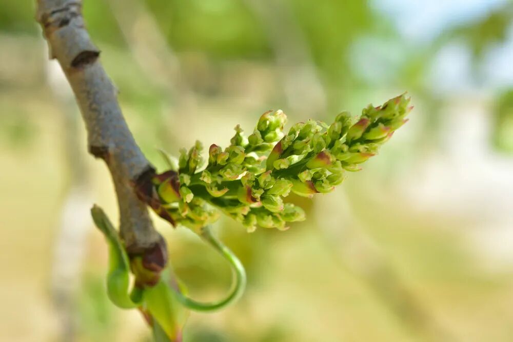 碧根果开花是雌雄同株,和核桃类似,长条状花为雄花,雌花要短小一些,授粉后雌花膨大成果实,雄花可以摘下来炒菜吃,不摘的话它自己枯萎脱落。果实到秋天就会炸开,里面的碧根果就成熟了。