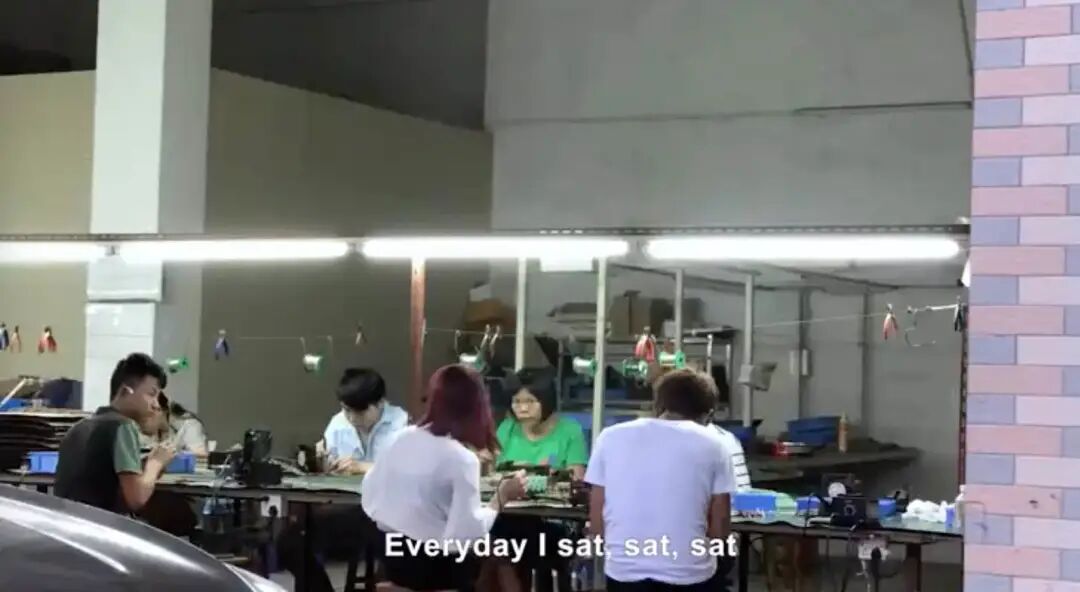 工厂机器按着一个节奏冷冷的响,杀马特在镜头里灰头土脸,双手机械得整理货物。
