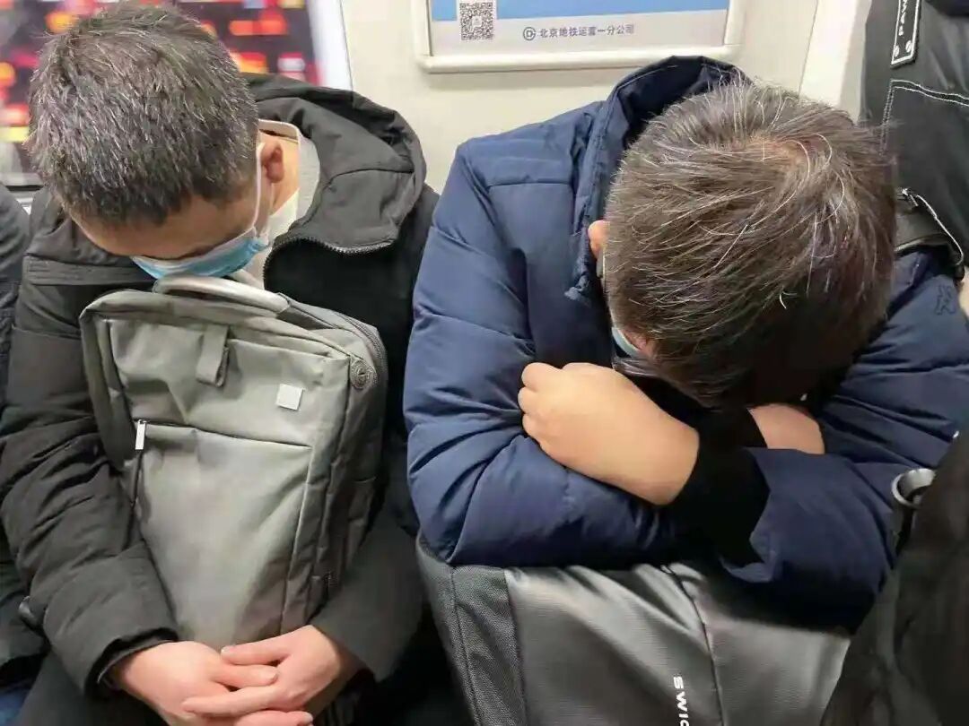 两个男生在地铁上垂头睡着,白头发多得像四五十岁的人。