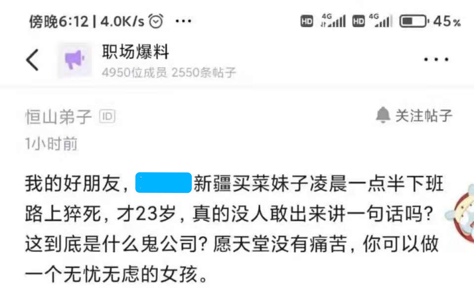 同公司的人说,她岗位的工作强度之高,感觉就是用生命加班。