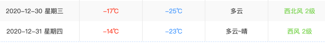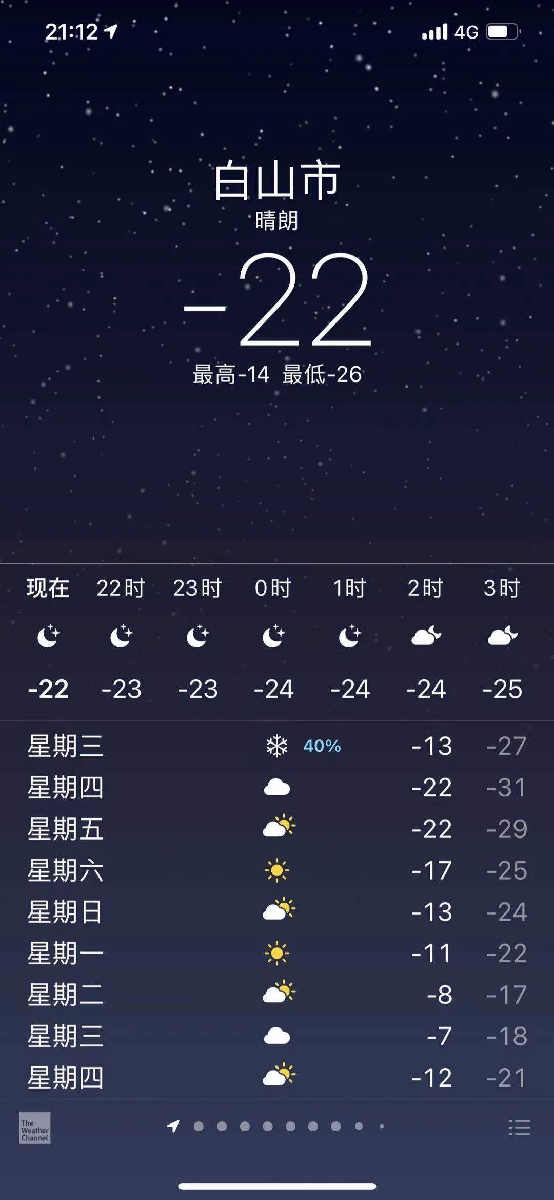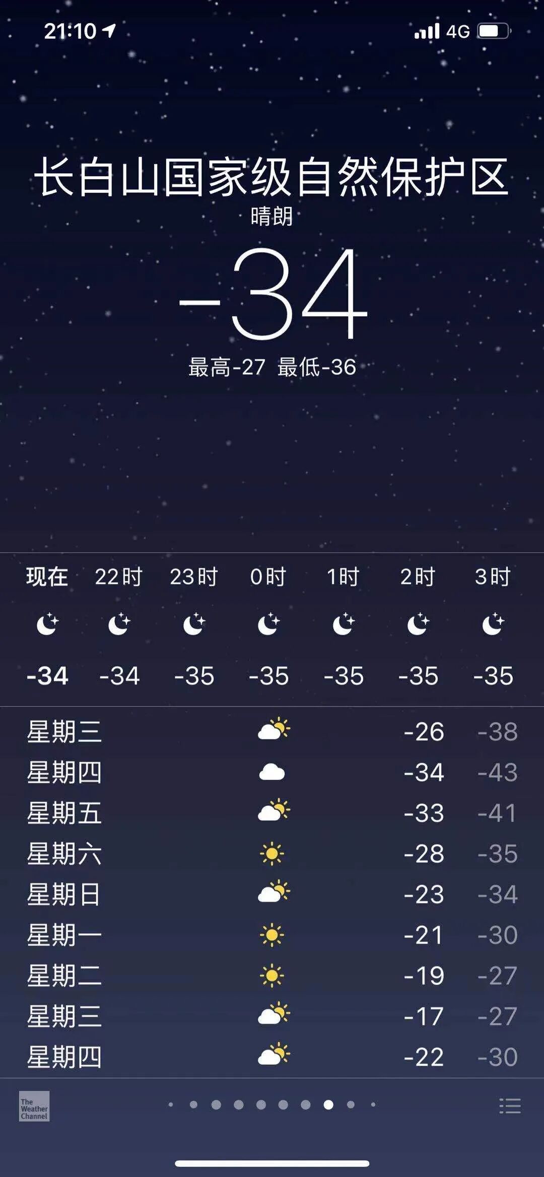 恰逢寒潮,我写文章的现在,长白山国家自然保护区的温度是零下34度,后天则是零下43度。滑雪场不在长白山上,所以要暖和一点,但室外也有零下22度,大部分时间都在零下20度左右: