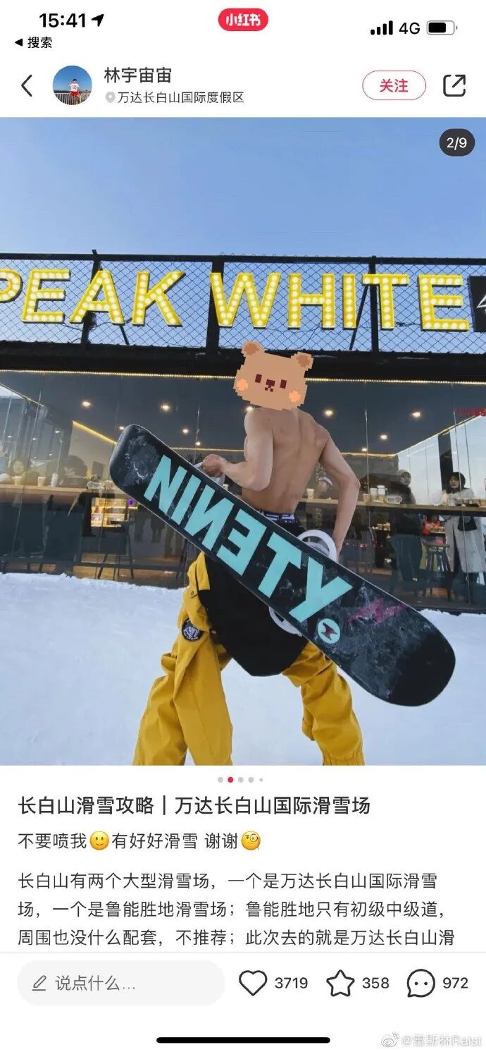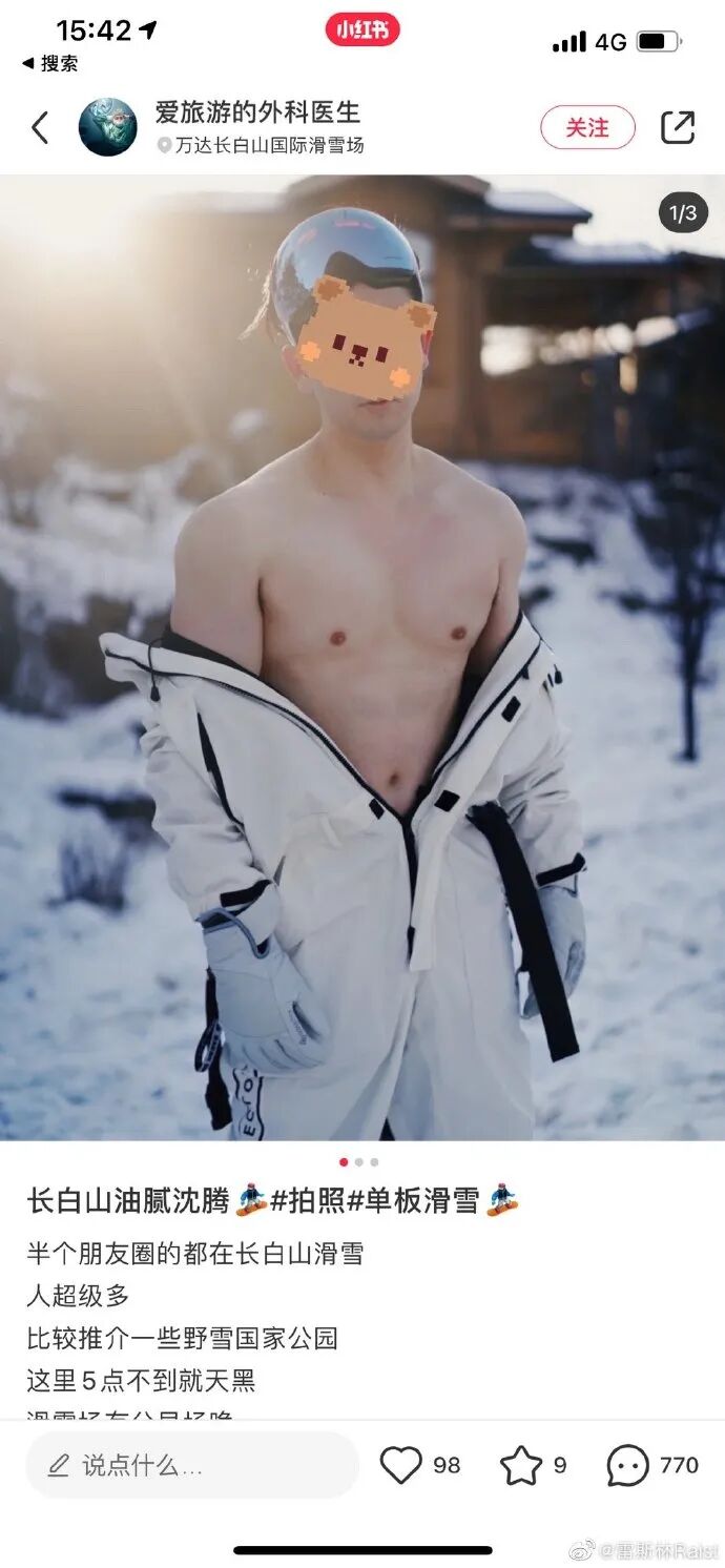 今天坐缆车的时候碰到几个本地阿姨,也互相叮嘱注意保暖一定不要感冒了,现在这个时间点,冻感冒了很麻烦。正是有这样的背景,我刚刚在小红书上用“滑雪”作为关键词搜索时,才感到“惊讶”。我当时在想,虽然崇礼有雪,而且风非常大体感温度很冷。但这毕竟是在河北,而且又只是11月26日,白天温度可能在零下5度以上,所以不觉得冷也可以理解。然后同一屏里,我很快又看到了一位在松花湖滑雪场的朋友:当然,这只是吉林边上的北大壶,风不大,而且这又是12月3号。这是12月25日圣诞节,当时这个滑雪场最低温度是零下22度,白天大概零下13度。则是12月31日跨年夜,正好是寒潮来的时候,当时最高温度已经只有零下15度左右了,日均温度更是在零下20度左右。当然,这两位还是有一些肌肉的男人,骨骼肌可以发热,我也看过不少俄罗斯肌肉男在寒风中裸体的例子,所以还不算太离谱。