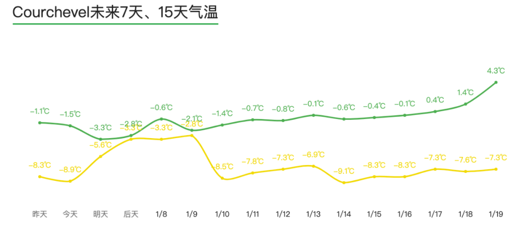 但翻到这里,我已经收起了所有的惊讶和戏谑,剩下的只有respect尊敬。网红朋友告诉我,最早这样做的,是欧洲的instagram网红们,她们只穿比基尼滑雪,拍出来的照片很好看,现在你在instagram上还能看到不少,甚至还有一些活动,专门就是一群人穿着比基尼去滑雪。因为欧洲很多滑雪场气温不低。比如欧洲乃至全世界最著名的滑雪圣地Courchevel,未来七天的平均气温:如果在12月的Courchevel,滑雪滑热了拍这种比基尼滑雪照片,不但不会觉得冷,可能还会觉得凉快。可我国东北不一样,我国东北位于大陆东侧,因为多方面因素的共同作用,几乎是全球同纬度冬天最冷的地方,没有之一。所以东北的滑雪场,远比欧洲、日本的雪场冷得多,本来气候不适合拍这样的照片。然而我们国家的网红,虽然一个比一个瘦,胳膊和腿一个比一个细,不像欧美网红那样壮实,有御寒的皮下脂肪和产热的骨骼肌。却可以在零下15度,零下20度甚至零下25度的温度下,毅然决然脱掉滑雪服,脱掉中间各种绒各种层,就为了拍出好看的照片。明明周围都是人看着,但需要一颗大心脏,完全不在意任何人的眼光做自己,拍高大上的好看照片。