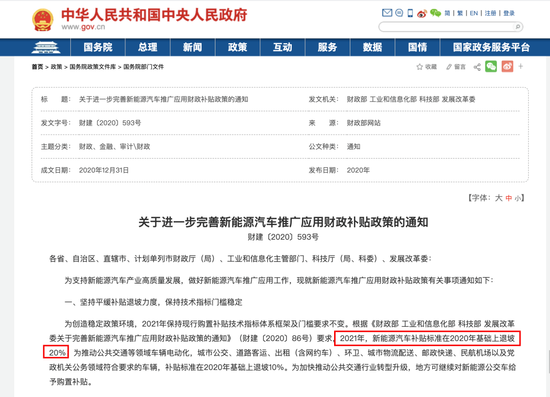 在新能源汽车一路向好的前景下,2021年新能源汽车补贴政策迎来再次收紧。2020年12月31日,财政部、工信部、科技部和发改委联合发布了《关于进一步完善新能源汽车推广应用财政补贴政策的通知》。《通知》中明确提到,2021年的新能源汽车补贴标准将在2020年基础上退坡20%,并且此项政策将在2021年1月1日起正式实施。值得一提的是,此次政策推出的第二天便开始正式实施,没有给车企留下任何过渡期准备,可见整个行业对于新能源汽车补贴进入最后退坡阶段已形成共识,以及有关部门对于新能源补贴退坡的坚决态度。