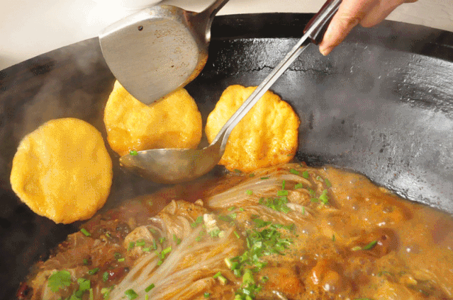 锅边贴上饼子,蘸着汤汁口感朴实到让人感动。外面寒气逼人,快来吃顿大铁锅暖一暖身吧!