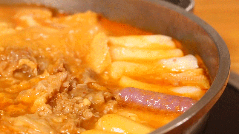 年糕、午餐肉、鱼饼、金针菇、豆腐、辛拉面……各种食材沉浸在浓浓的韩式辣酱汤中,辣中又带着鲜甜,一下子就唤醒了味蕾!
