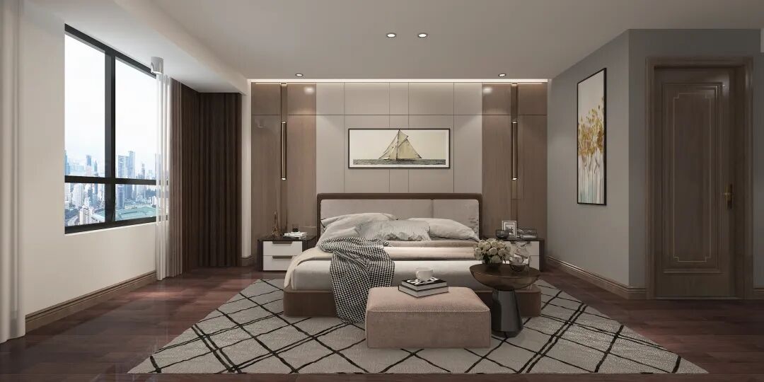 低调沉稳的实木地板,让卧室静下来,时间仿佛按下了暂停键。黑白格纹,制造视觉焦点,一抹粉色,温柔浪漫,融化了空间的冷静与克制。