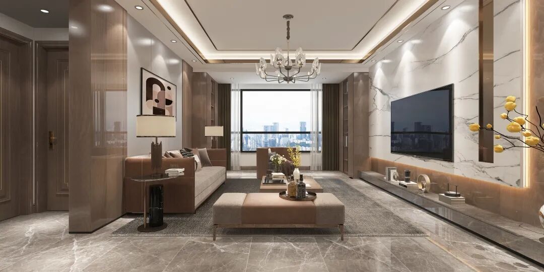 质感光洁的大理石铺满整个空间,以高级灰色为基调,搭配莫兰迪粉、奶油白等柔和纯净的色彩,室外光线在不同材质间辉映交织,展现一幅平静而雅致的生活画卷。