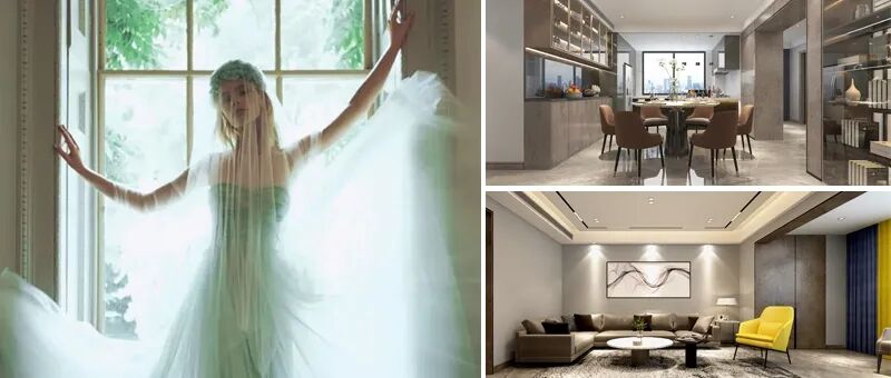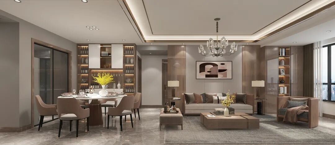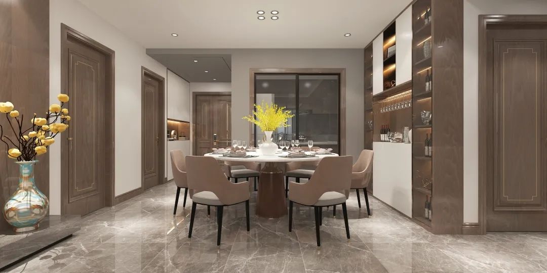奶油白的柜面,反照出细腻无声的光感,圆形大餐桌,是内心团圆的向往,融入些许金属质感,让每一餐都充满了仪式感。
