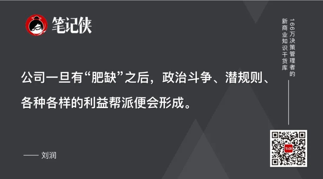这时,公司出现了一个词“肥缺(收入多的官职)”,公司一旦有“肥缺”之后,政治斗争、潜规则、各种各样的利益帮派便会形成。