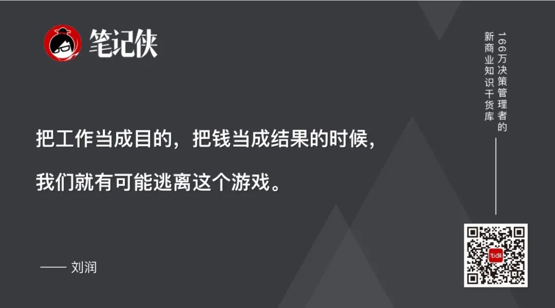 一旦把收入当成目的时,工作手段就以能不能拿到收入为目的。把工作当成目的,把钱当成结果的时候,我们就有可能逃离这个游戏。