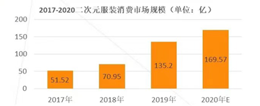 调查机构IT桔子在2020年3月份发布了一份《2021-2020年中国二次元服装消费市场分析报告》。数据显示2021年以JK制服等为代表的二次元服装市场规模达135.2亿元,同比增长90.6%,预计2020年将达到169.57亿元。