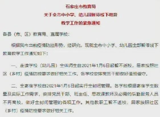 1月6日起,石家庄全市中小学、幼儿园全部暂停线下教育教学工作。