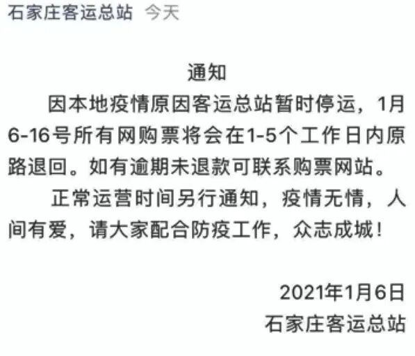1月6日,石家庄客运总站发布通知,因本地疫情原因客运总站停运。