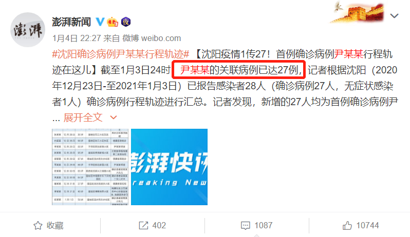 果不其然,就在全国人民欢度元旦假期的最后一天,沈阳报告新增27例本土确诊病例,全部都是和这位老太太有关。