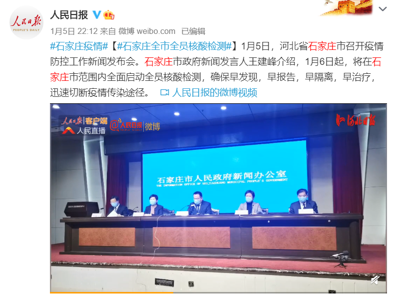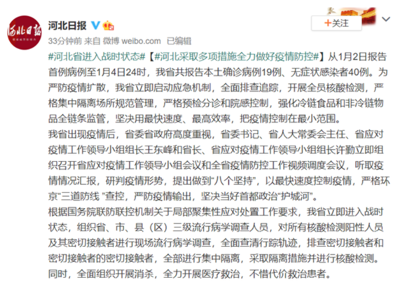 河北政府宣布全省进入战时状态,全面启动全员核酸检测。