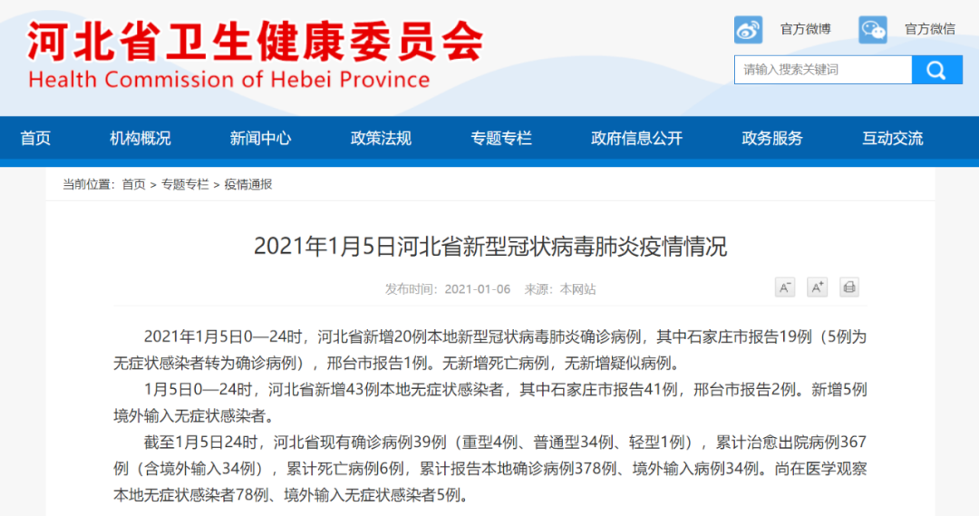 据河北卫健委统计,1月5日0-24时,河北省已经新增了20例本地确诊病例,43例无症状感染患者。