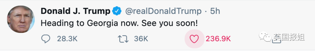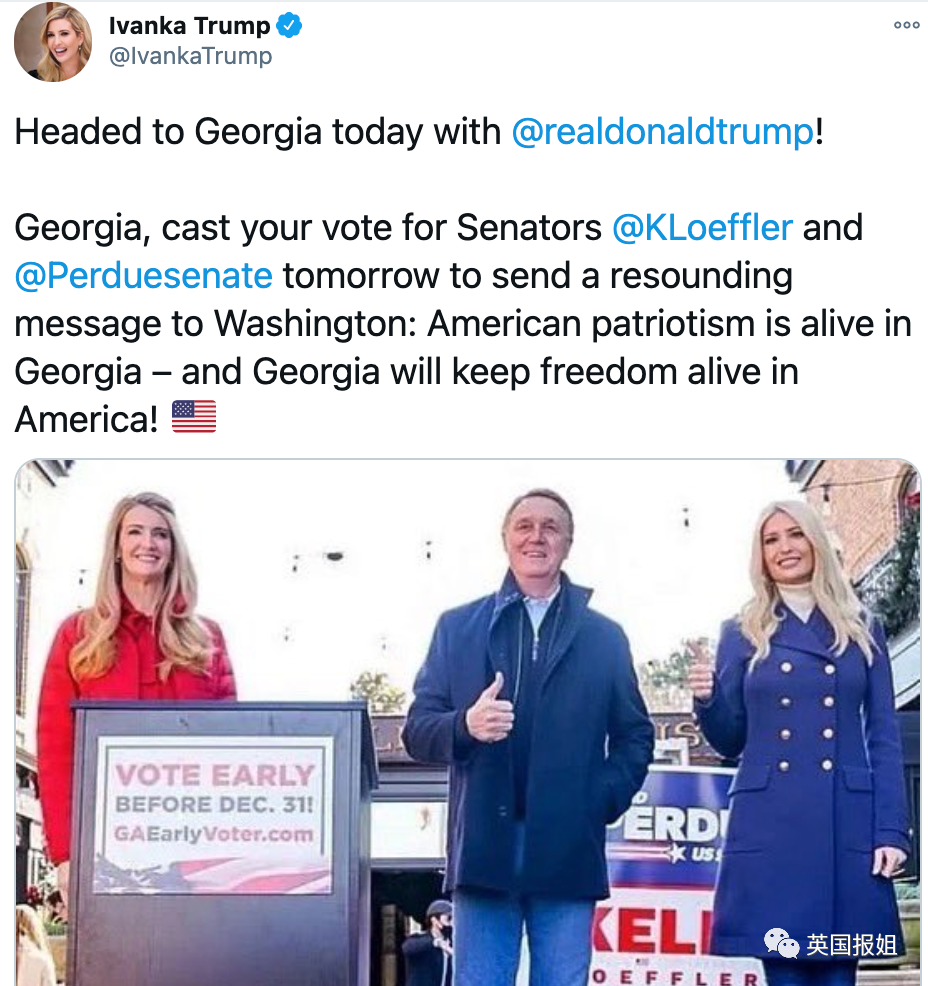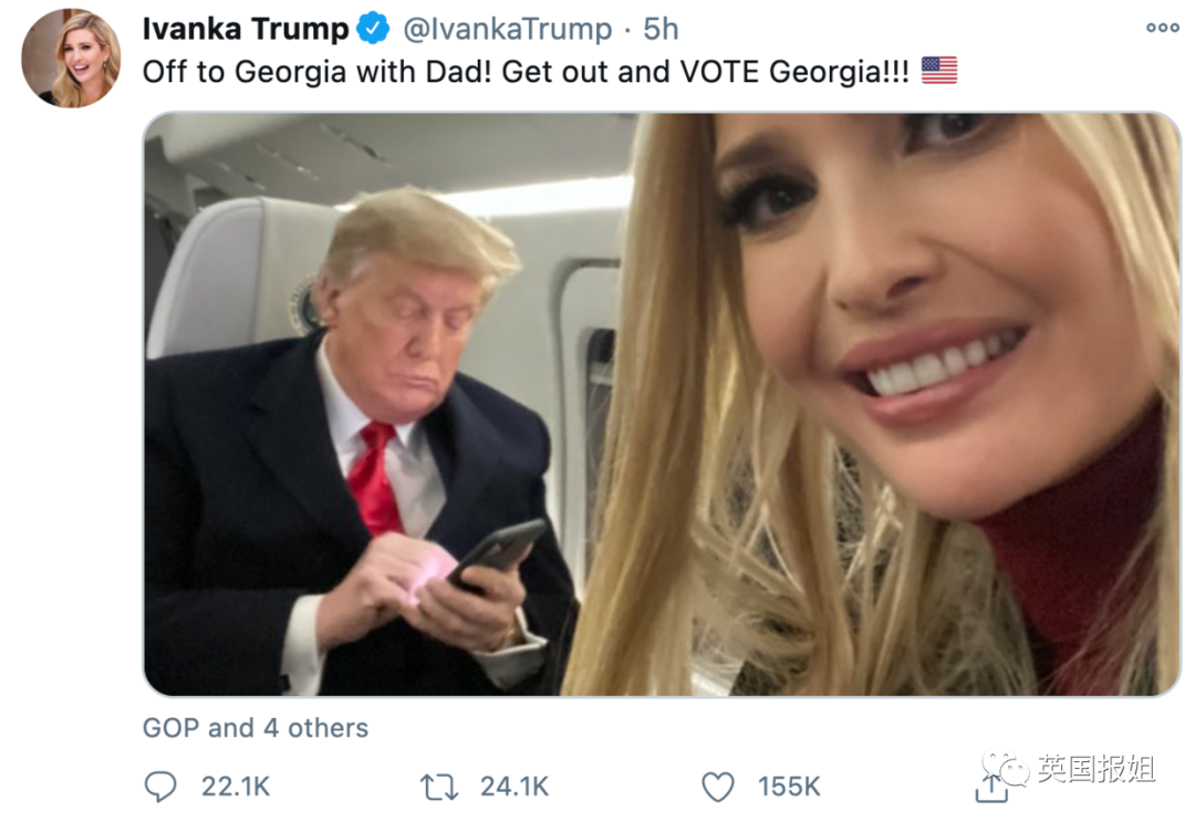 今天上午,川普的女儿伊万卡得瑟地发推,表示:我和我爹已经在去往乔治亚的路上了。