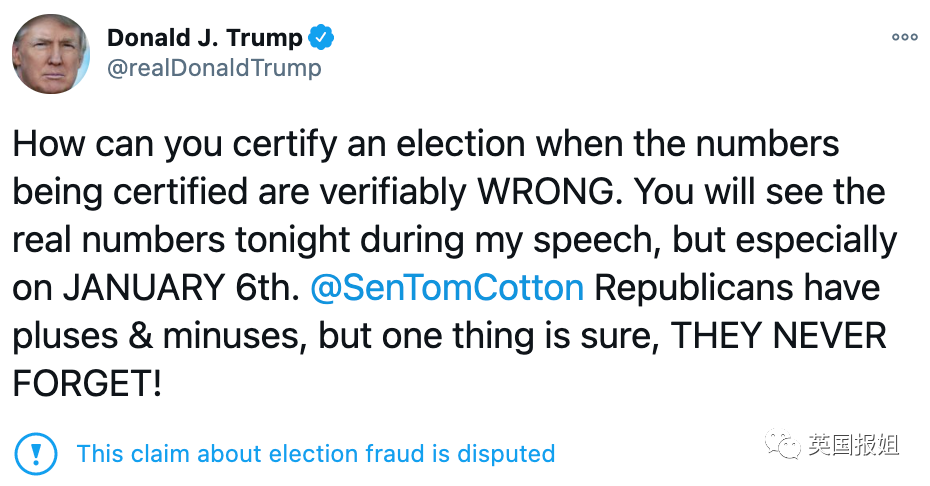 气得川普发推艾特Cotton,说他思想有问题。怎么能信口开河说这个“漏洞百出的”选举没问题,还让他6号等着瞧。