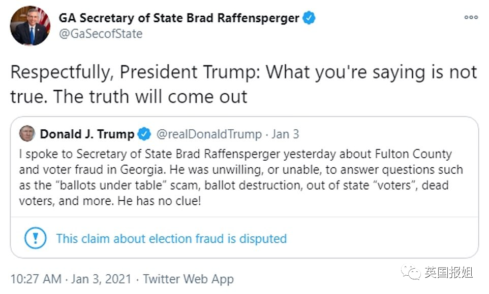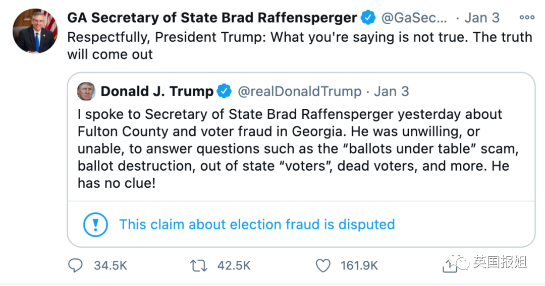 这让川普很不能接受啊,在大选结束后一直揪着乔治亚州不放,这一则推特,更是把乔治亚州“丢票”的责任,丢到了州务卿Brad的身上。