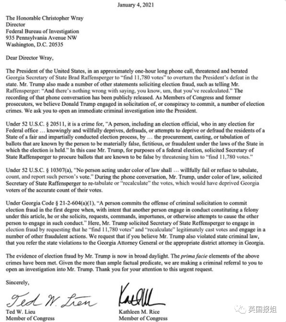 两名民主党众议员致信FBI局长,要求以“干涉选举罪”发起联邦诉讼调查。
