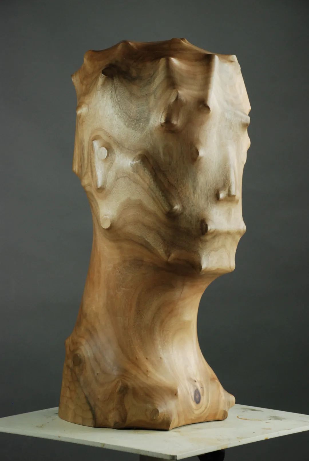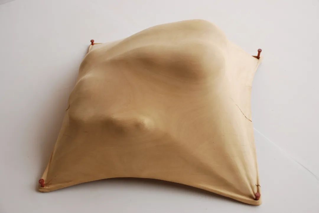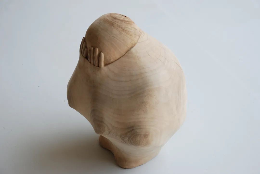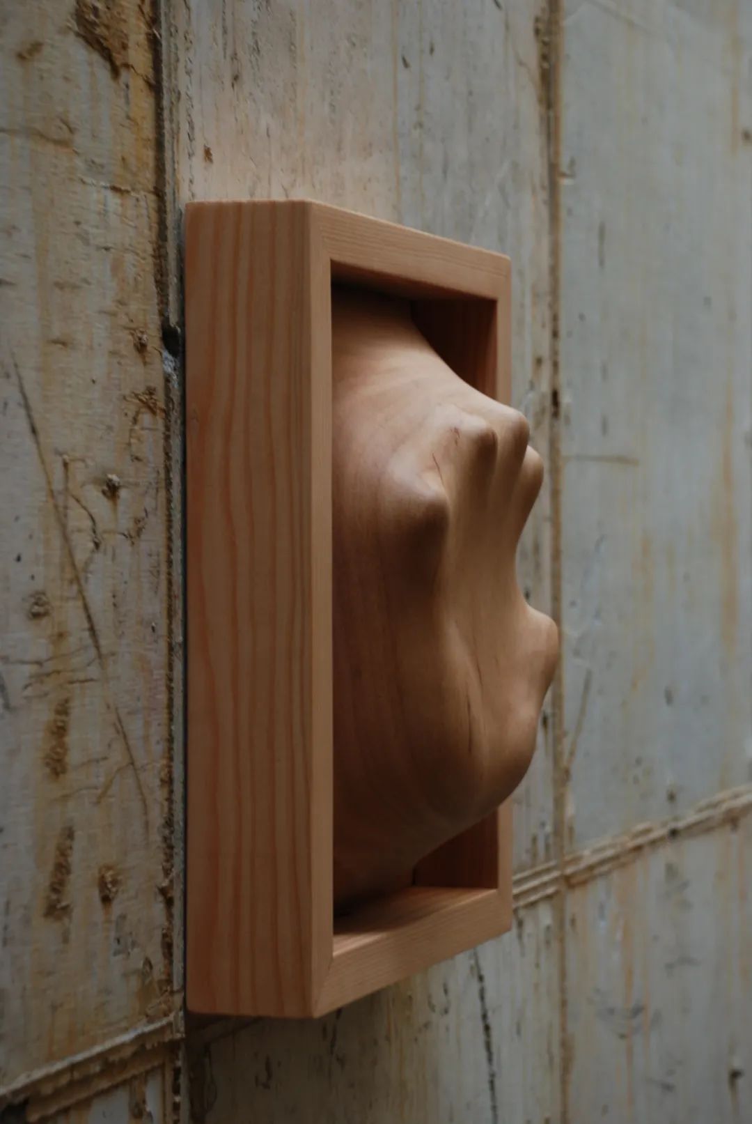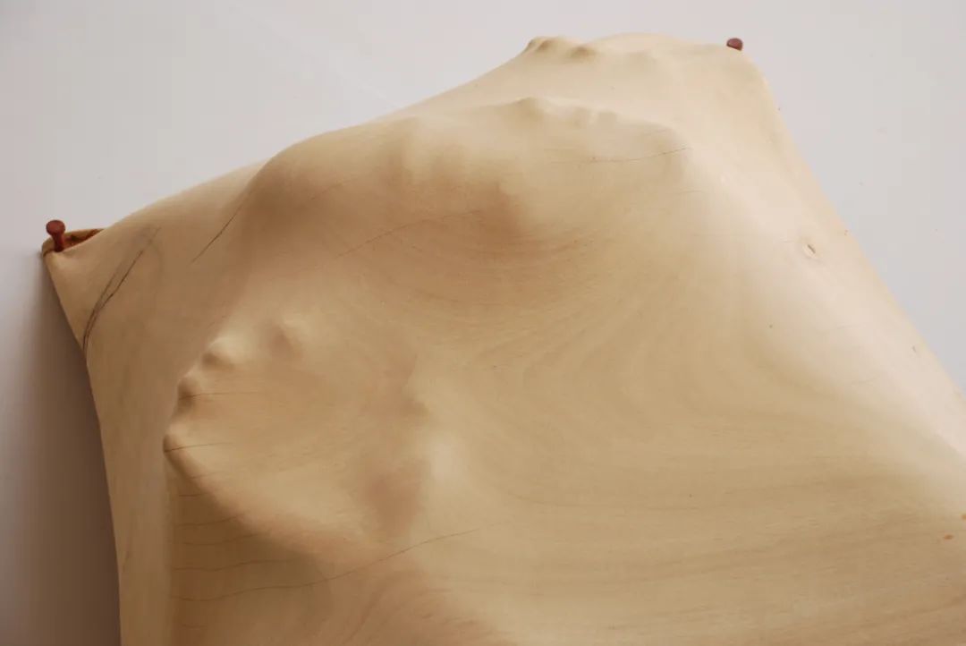 在大学和研究生期间,我花了很多时间去研究被包裹的形象。我用一种弹性布去崩、包覆自己,请朋友来做摄影,打光去观察凸显的那种身体的立体感,同时也切身去感受包覆之下会让你看到、感受到什么。整个的制作过程需要很长时间。一整块原木,先用链锯切大形,然后用雕刻刀去修出细节的特色,最后用锉刀、砂纸将表面磨得有张力。这样刻出来的皮膜会感觉木纹在上面有流动感,顺着突出物变化。