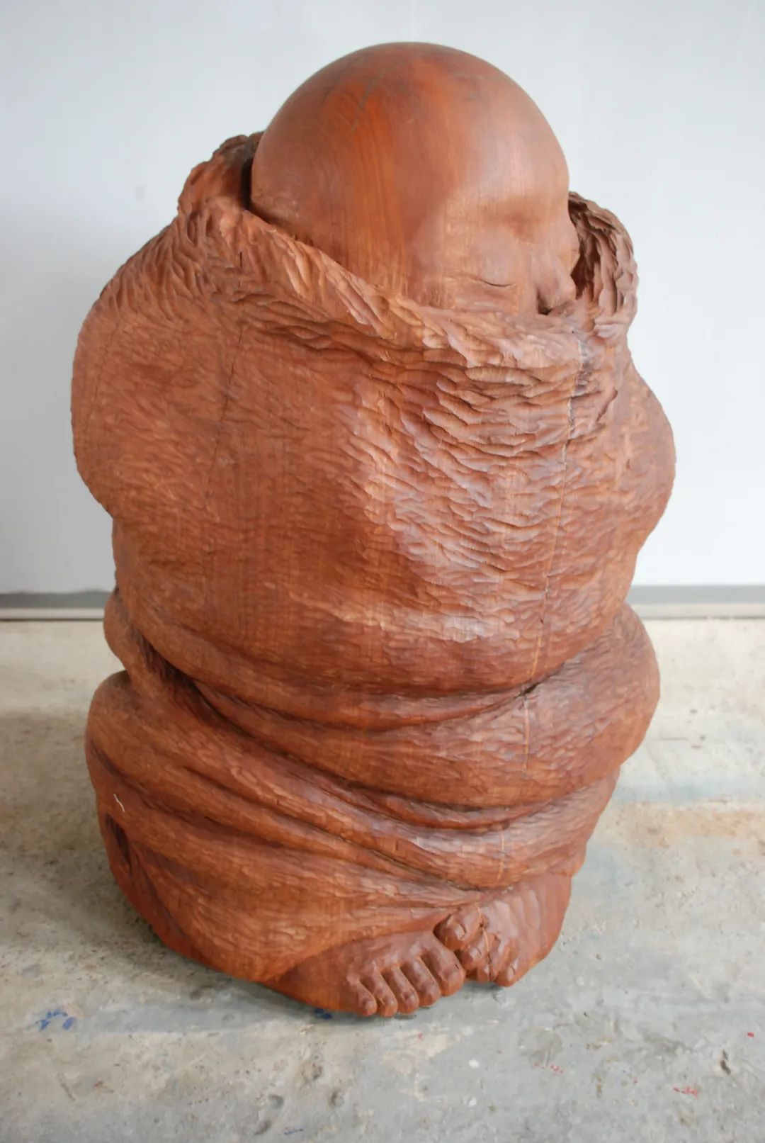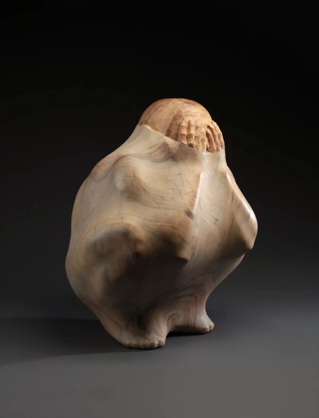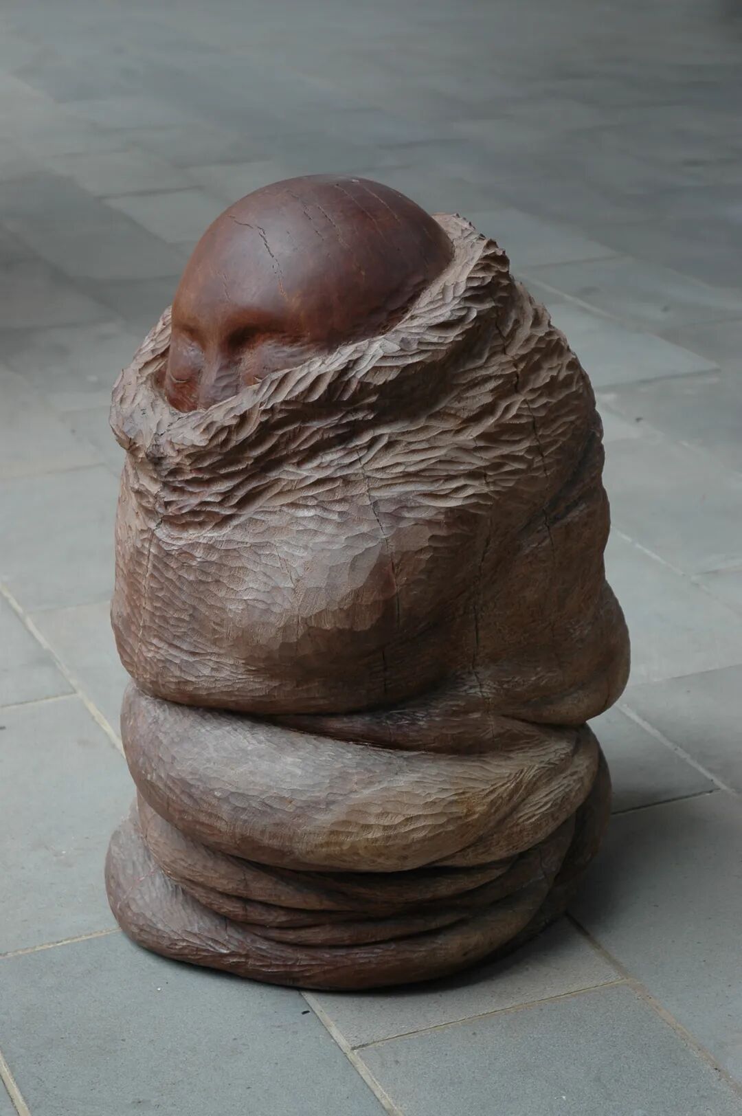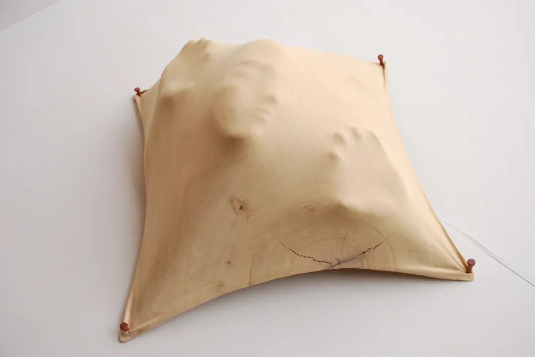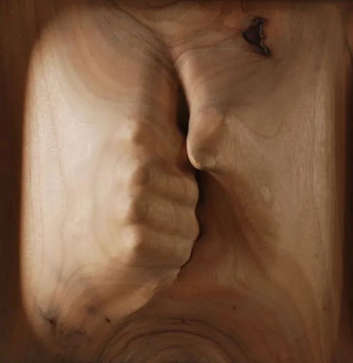 在大学和研究生期间,我花了很多时间去研究被包裹的形象。我用一种弹性布去崩、包覆自己,请朋友来做摄影,打光去观察凸显的那种身体的立体感,同时也切身去感受包覆之下会让你看到、感受到什么。整个的制作过程需要很长时间。一整块原木,先用链锯切大形,然后用雕刻刀去修出细节的特色,最后用锉刀、砂纸将表面磨得有张力。这样刻出来的皮膜会感觉木纹在上面有流动感,顺着突出物变化。