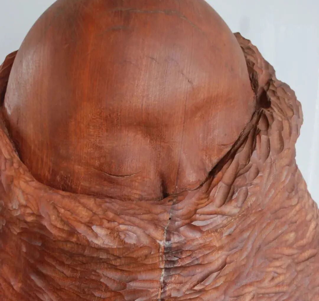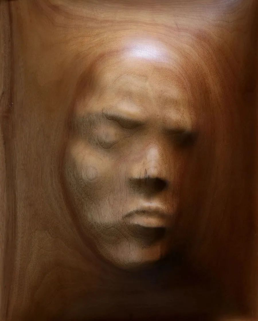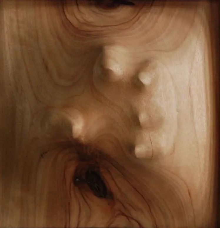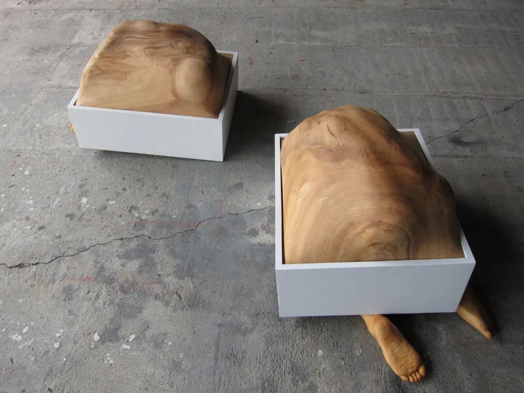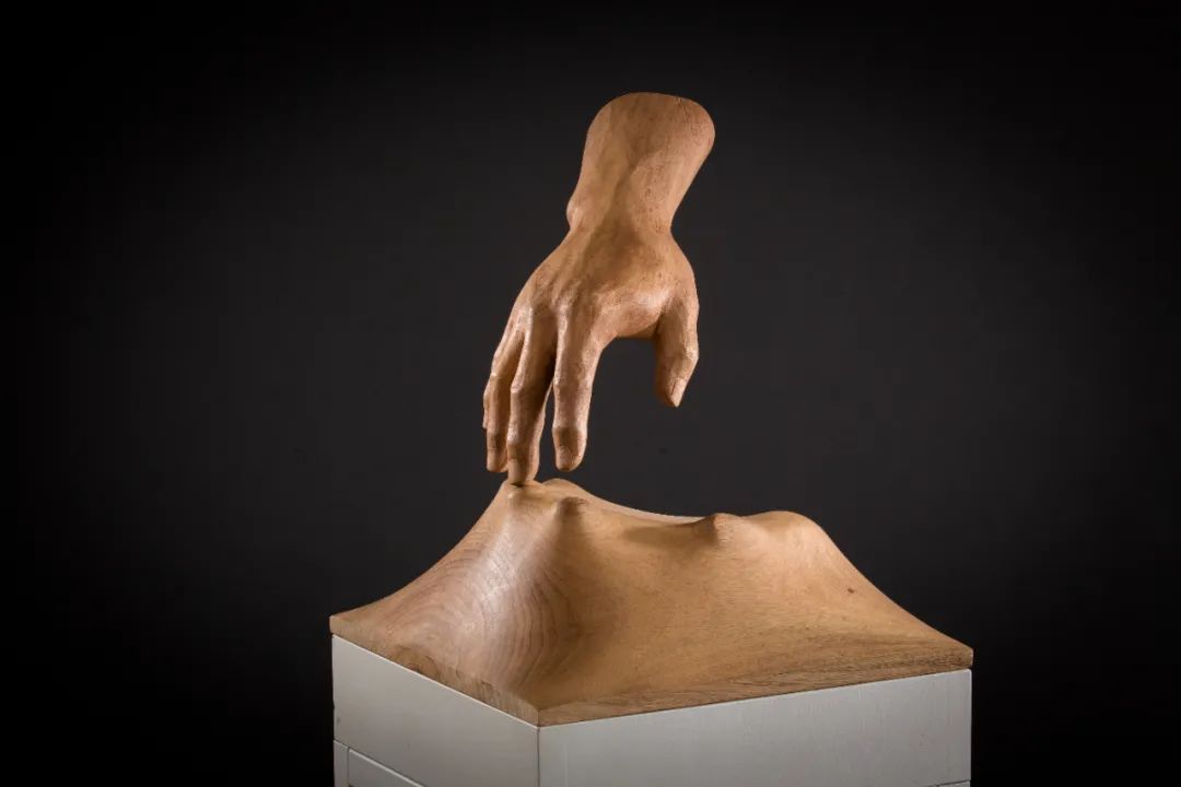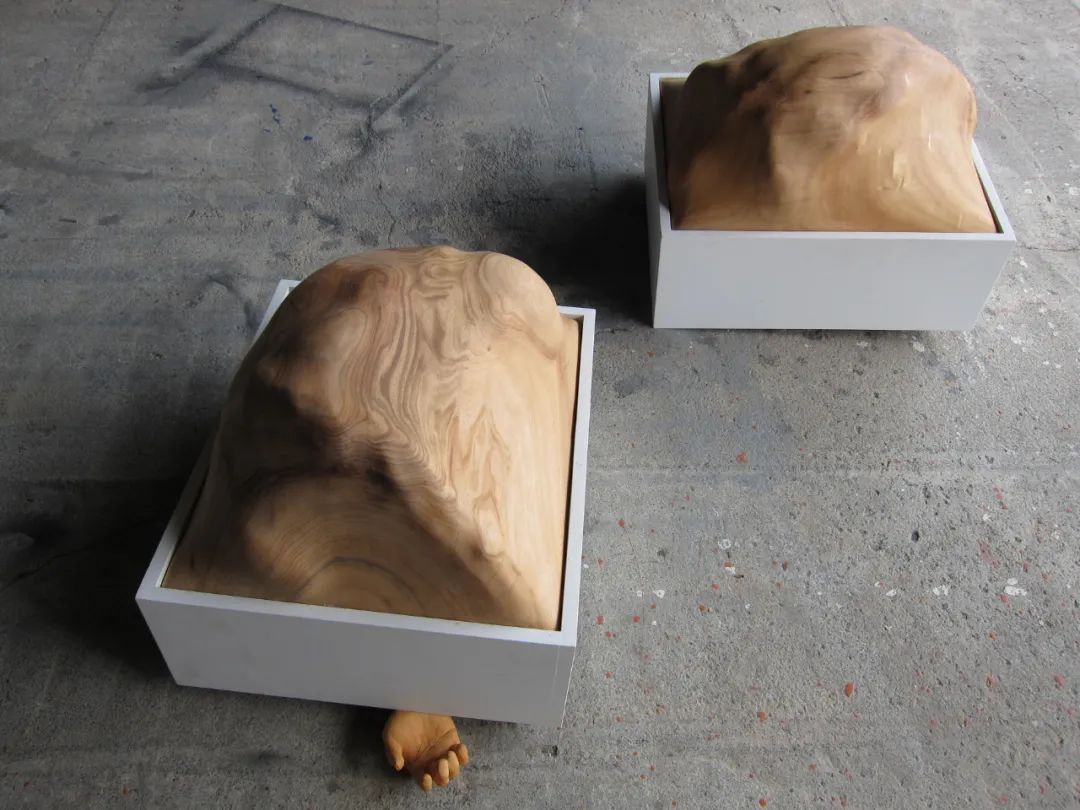 在大学和研究生期间,我花了很多时间去研究被包裹的形象。我用一种弹性布去崩、包覆自己,请朋友来做摄影,打光去观察凸显的那种身体的立体感,同时也切身去感受包覆之下会让你看到、感受到什么。整个的制作过程需要很长时间。一整块原木,先用链锯切大形,然后用雕刻刀去修出细节的特色,最后用锉刀、砂纸将表面磨得有张力。这样刻出来的皮膜会感觉木纹在上面有流动感,顺着突出物变化。