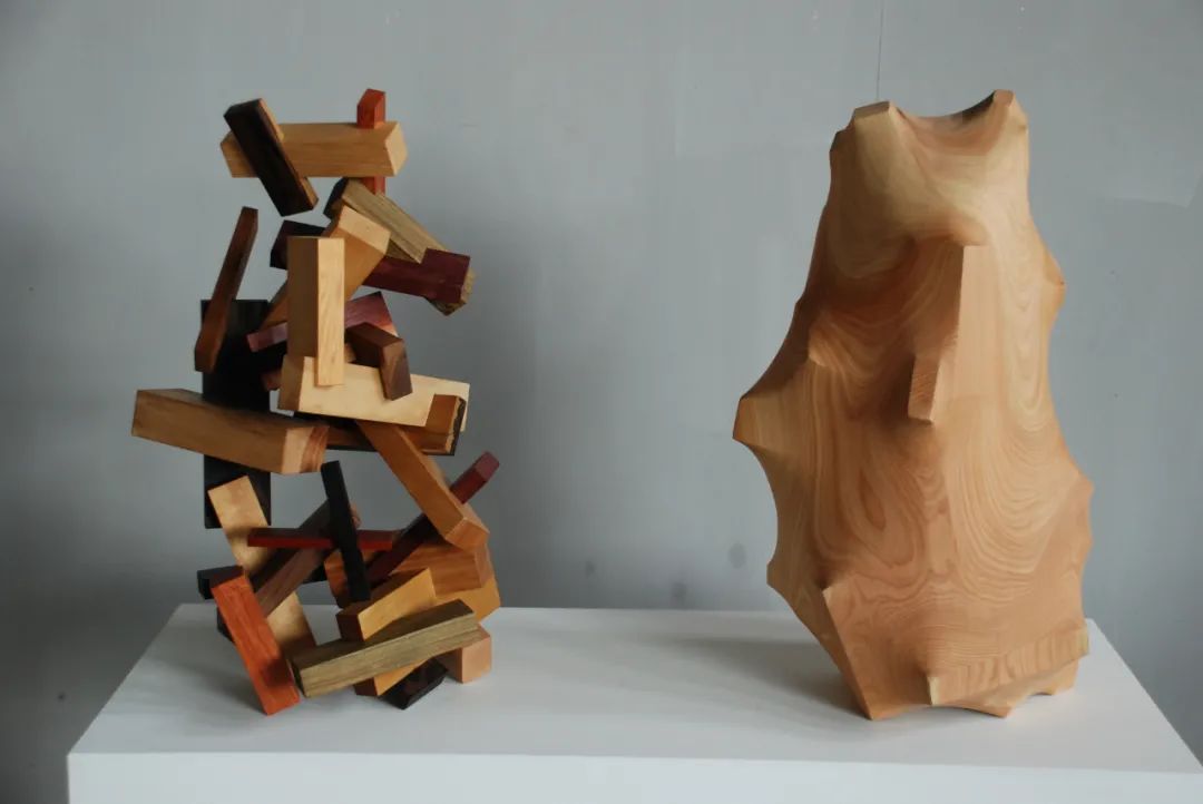 这系列有一件作品我用了自己收集的大概30种色彩、软硬不同的木头,绿潭、紫杏木、红酸枝、黑檀木、白橡木……每个木头又用不同的卡组方式做结合,通过木的百态去呈现人的百态,和不同的相处方式。另一边将它包裹起来,形容这个社会,我们所有人,其实还是一个整体。