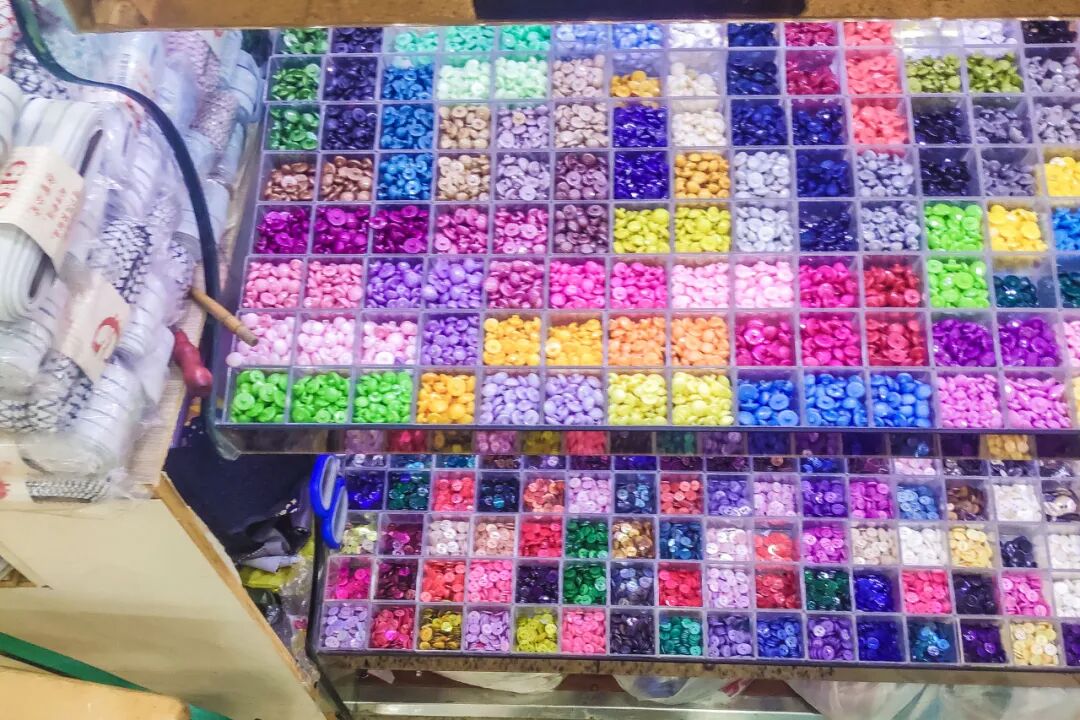 除了摄影、音响器材,大沙头还有布料批发市场。里面各种纱的、棉的、布的、亮片、纽扣、针线...许多服饰行业的布料和用品都能在这里淘到。