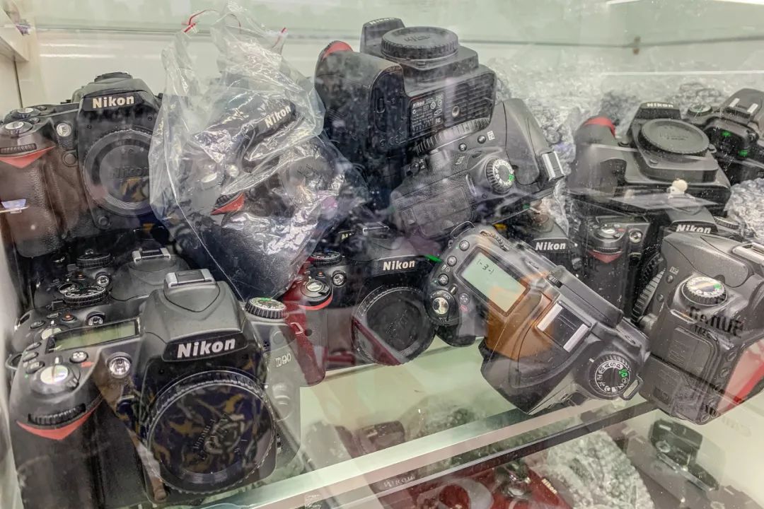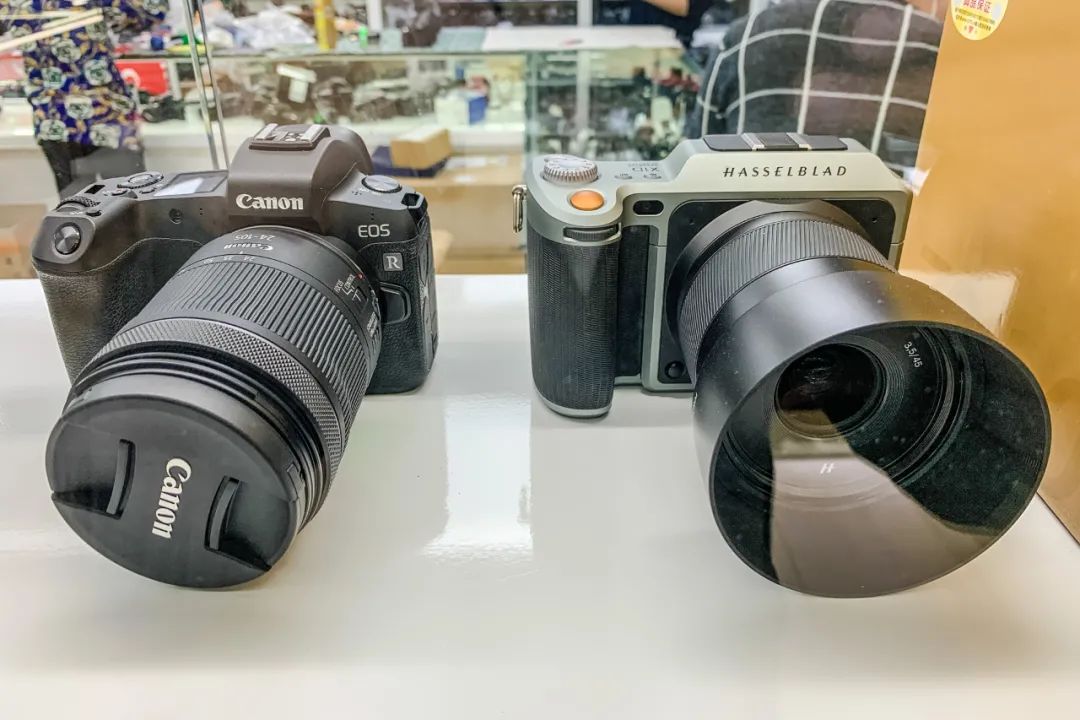 摄影器材的机身、镜头都被有序地排列好,等待“有缘人”。