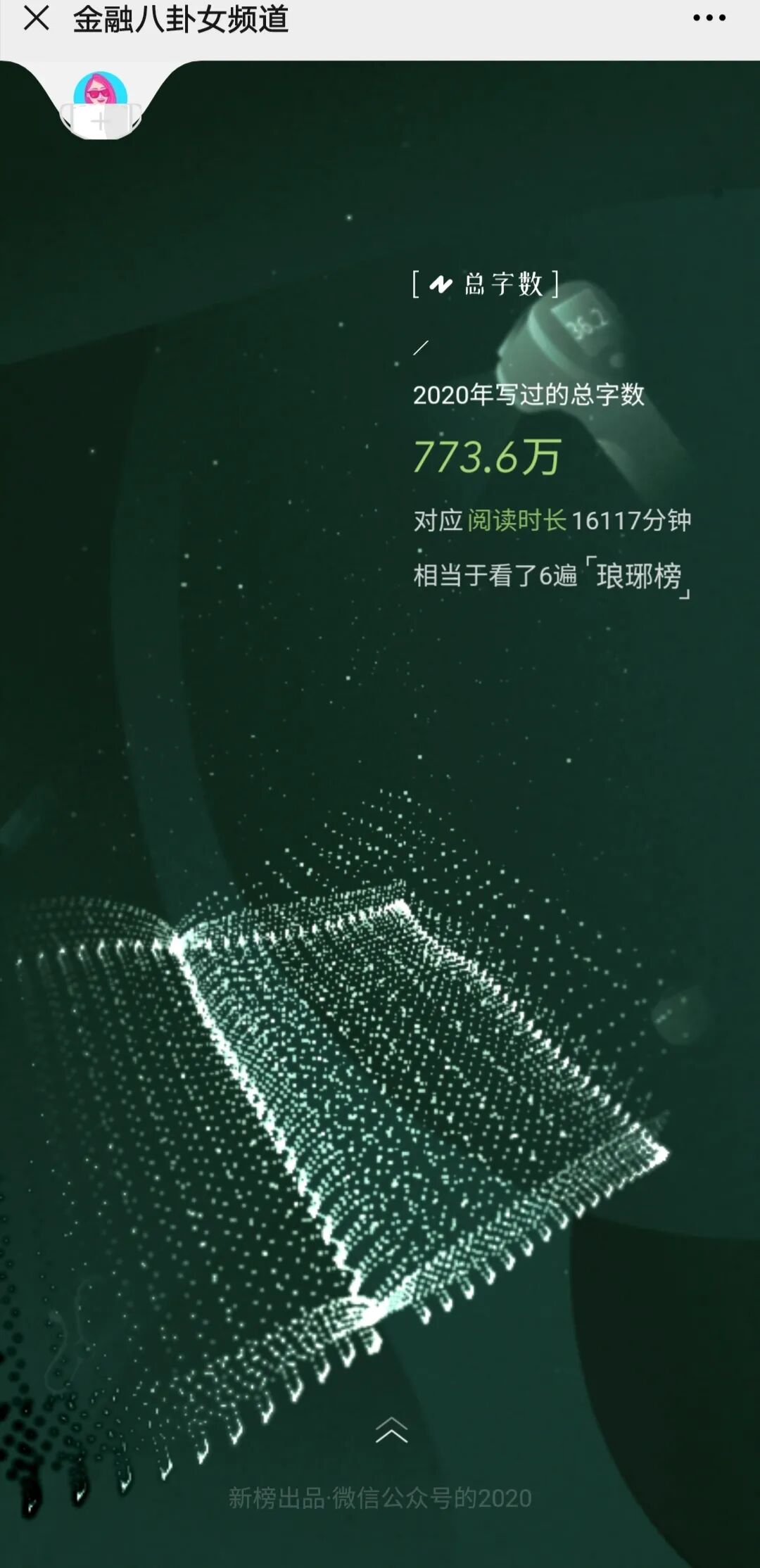 据新榜发布的数据显示,金融八卦女频道在2020年的传播力超过99.88%的运营者。2261万的累计阅读数,6万的累计在看数,你们的每一个在看都是八妹前进的动力。2020年,八妹写过的总字数达773.6万,对应阅读时长16117分钟,每天蹲守看八妹文章的小伙伴相当于看了6遍《琅琊榜》,感谢你们的不离不弃。2020年,金融八卦女频道的勤勉度超过98.66%的运营者。从企业、行业到生活际遇,2020年大家在一起见证、感受了太多。这一年来,金融八卦女秉承着一份坚持,在365天里共发文1328篇。2020年,金融八卦女频道的热点覆盖率超过99.90%的运营者,关注过 “美股十天内五次熔断、校长张桂梅反对学生当全职太太” 等热点。