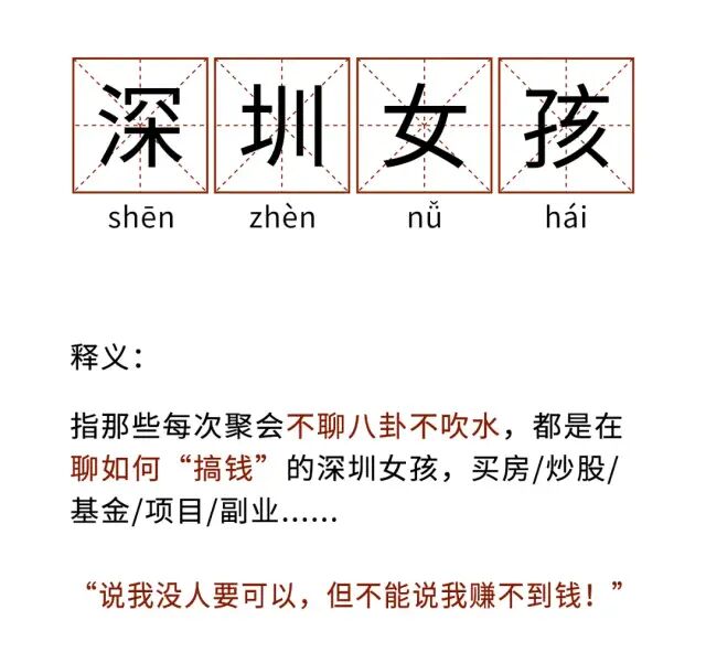 或许在北京,你会听到“我有个梦想,我想创业”的激昂话语,但是在深圳,所有的人都目标明确,就是——搞钱。来到这里的人都知道,没有钱,没有“楼”,干什么都只能是寸步难行。据深数据显示,2020年1-9月,深圳女性置业者购房数量占比达到53.3%,女性房产户主人数为63.67万人。她们靠自己买房,收入来源不只是主业,而是基金、股票、代购、直播等各种各样能来钱的副业。她们没有真正的休息日,因为那48小时都要用来培训、深造、学粤语、学英语、学金融、学理财,学各种能让自己“增值”的课程。其实,与其说深圳女孩爱搞钱,倒不如说,很多从外地来到深圳打拼的年轻女孩,她们都爱搞钱。在豆瓣买房小组、丧心病狂攒钱小组里,到处都是她们留下的成功案例分享,她们把“婚前财产”挂在嘴边,理财账单才是她们最关心的数字。
