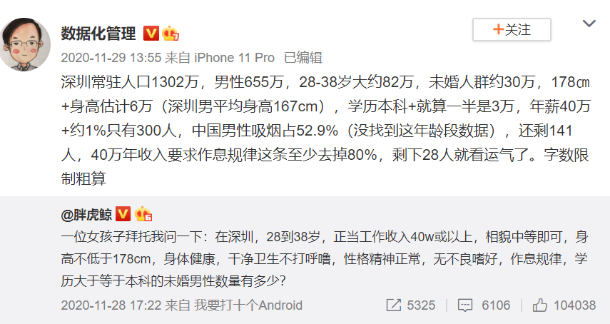 一位女孩子拜托我问一下:在深圳,28到38岁,正当工作收入40w或以上,相貌中等即可,身高不低于178cm,身体健康,干净卫生不打呼噜,性格精神正常,无不良嗜好,作息规律,学历大于等于本科的未婚男性数量有多少?