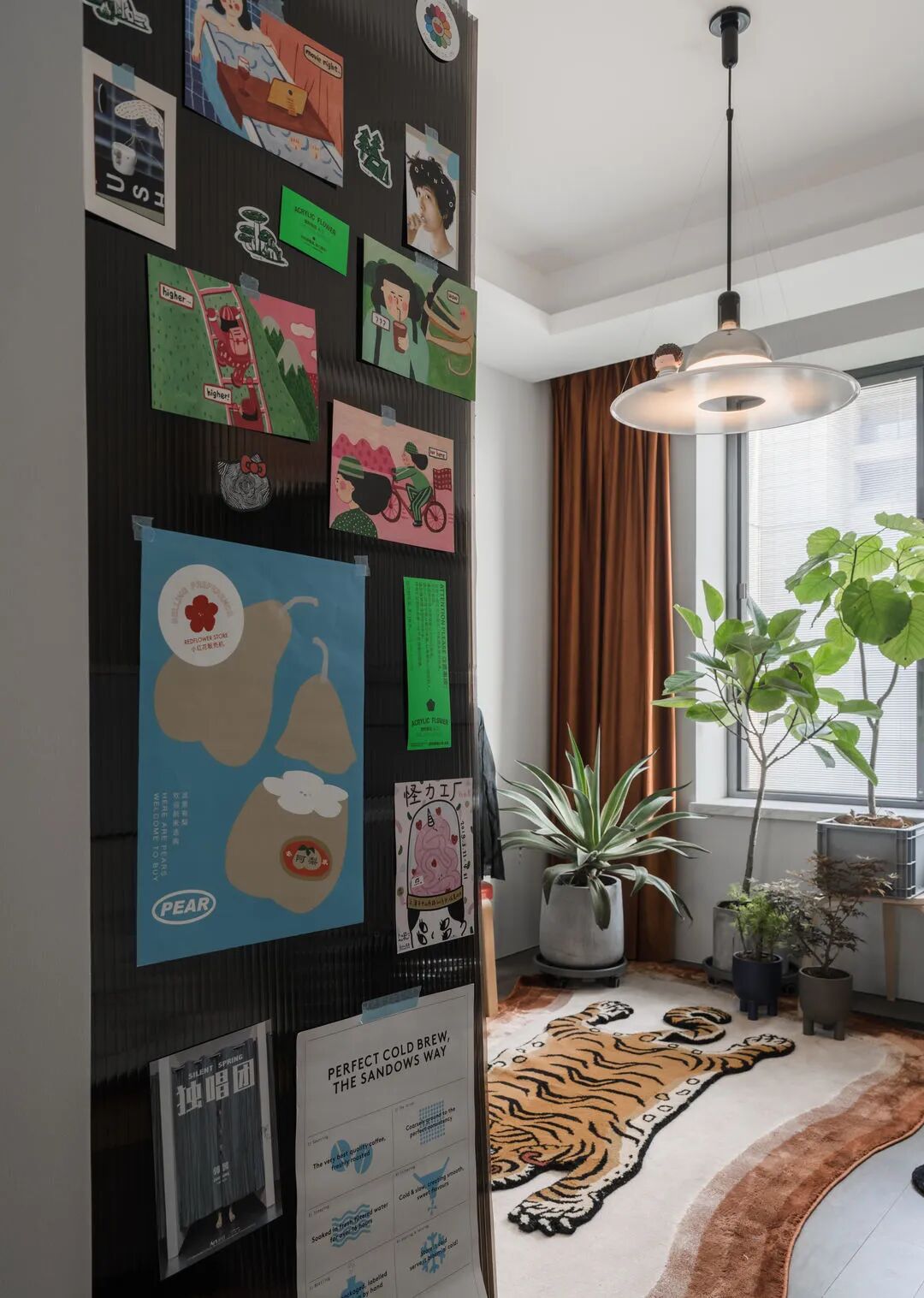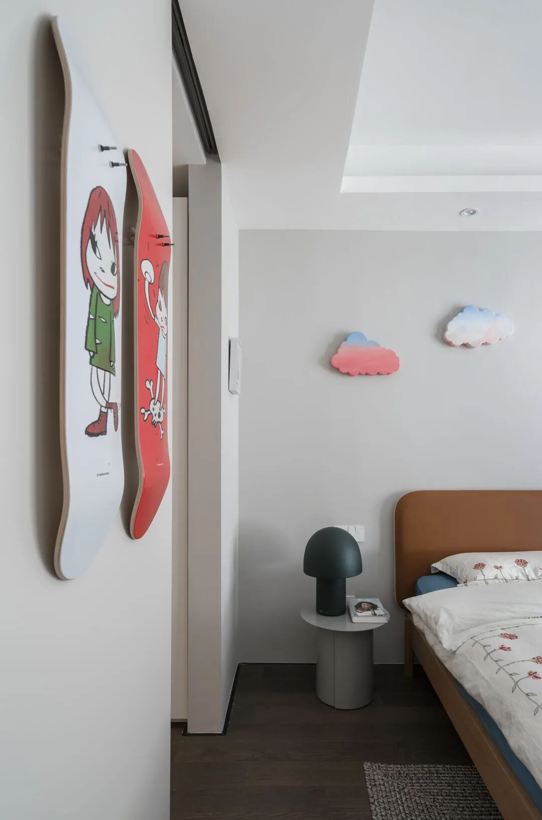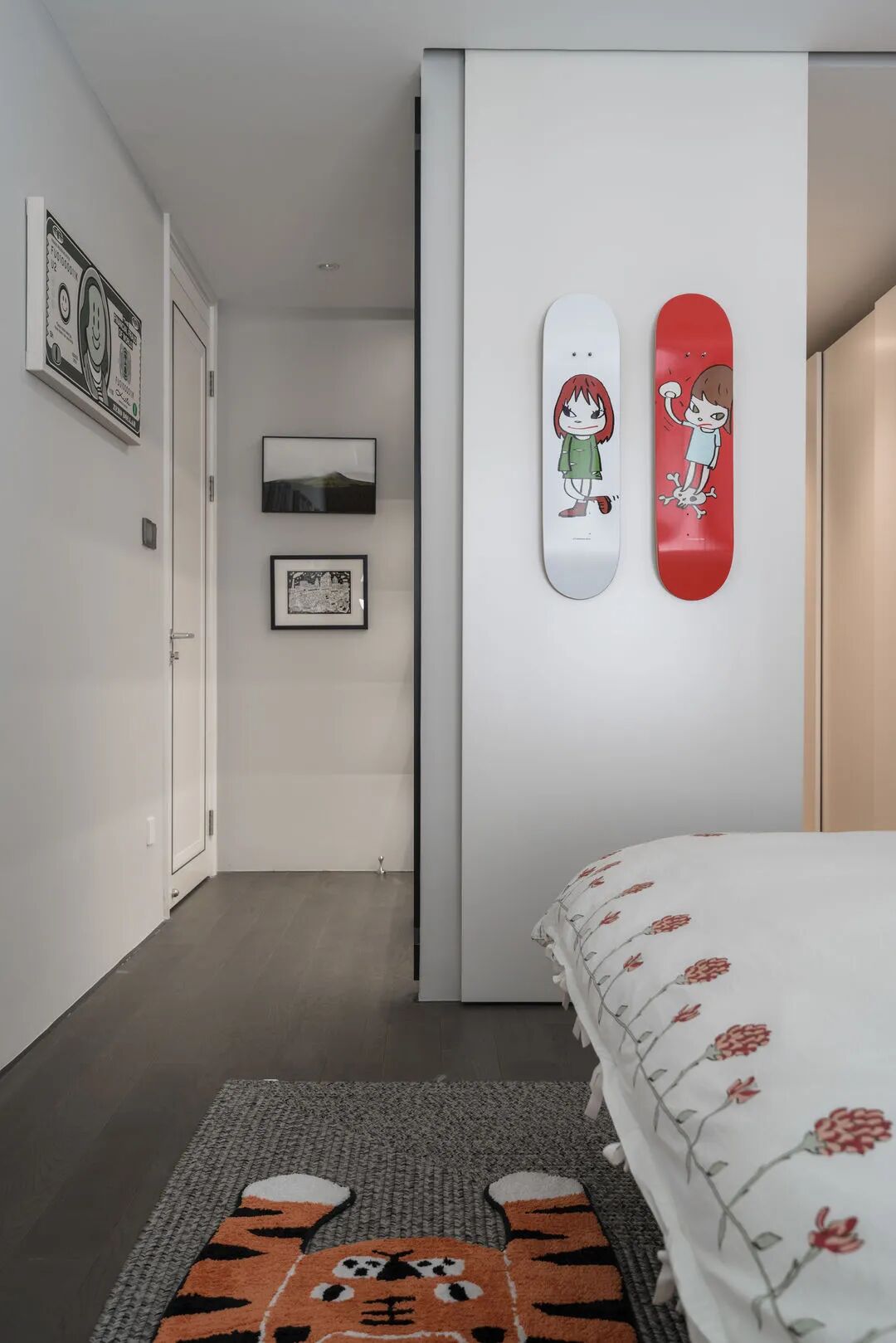挂画是法国街头艺术家André Saraiva的原版.桌上的饰品也是跟墙面呼应起来。
