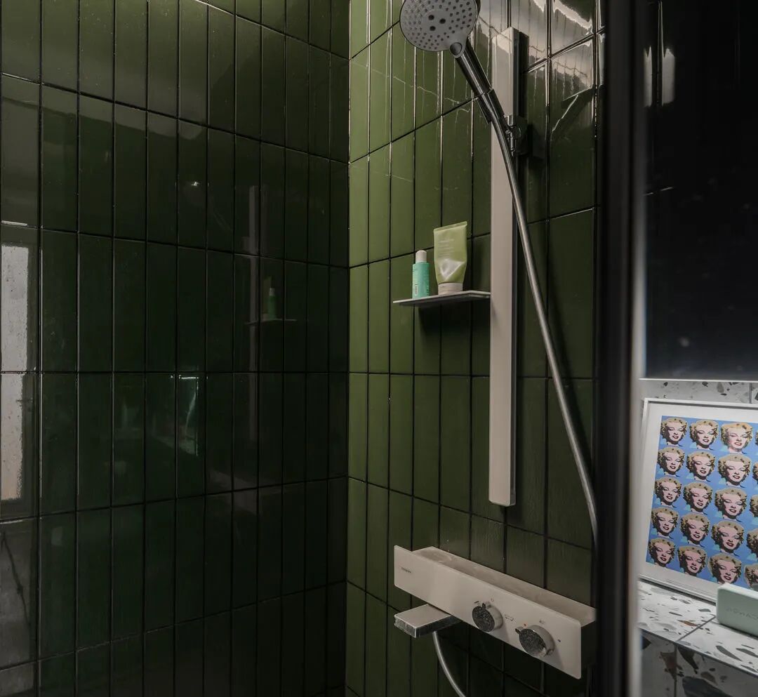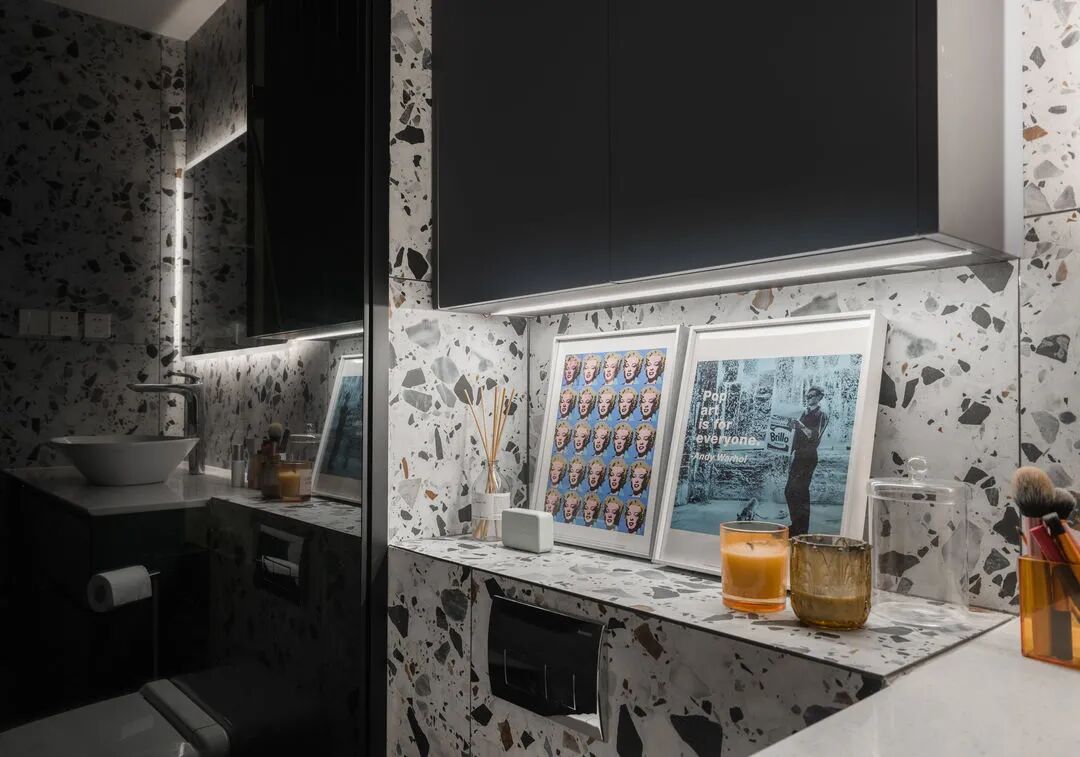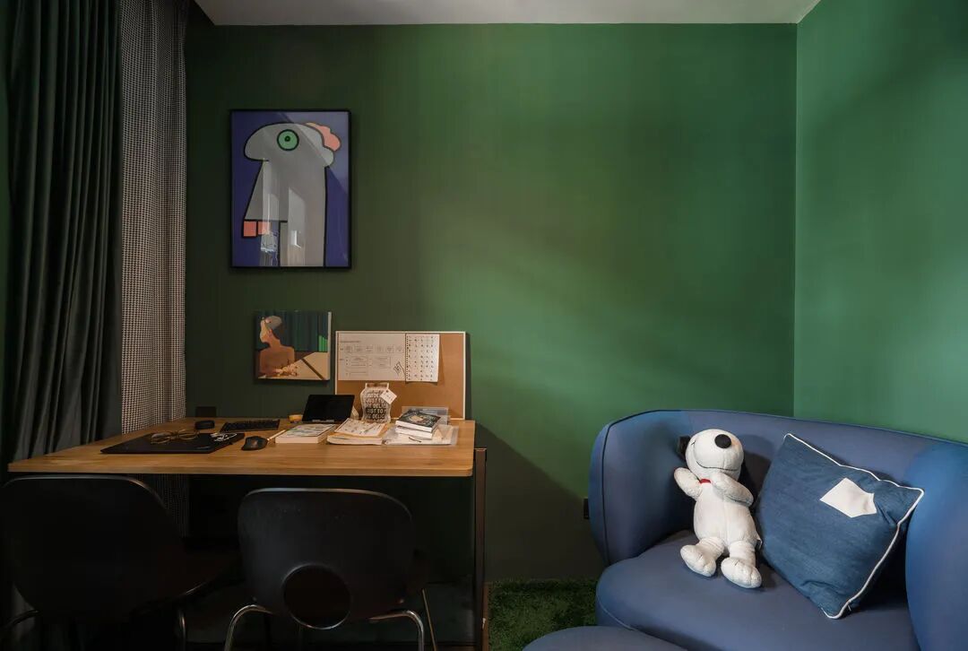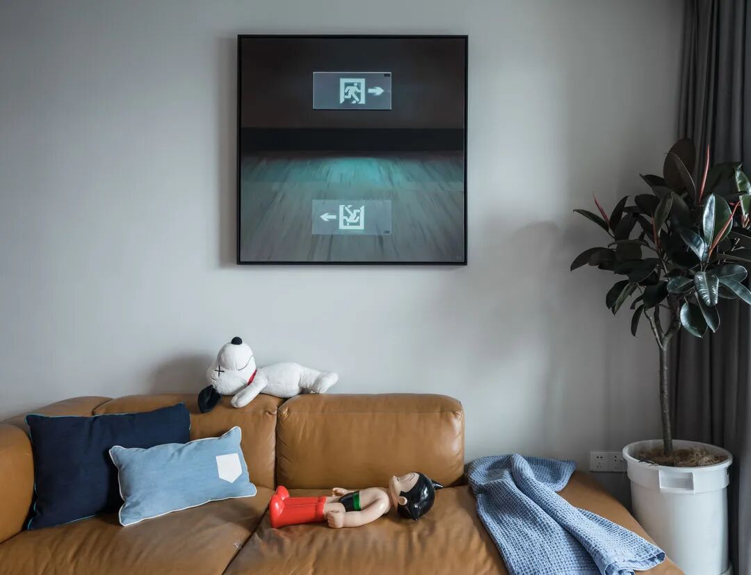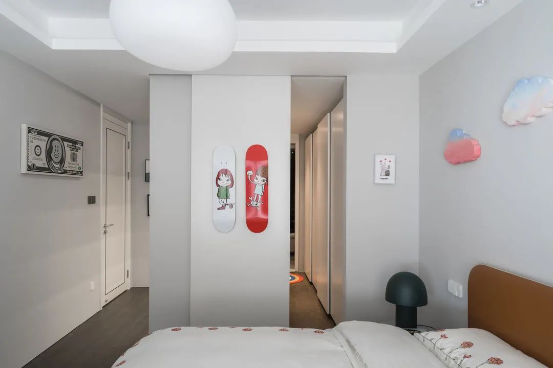 挂画是法国街头艺术家André Saraiva的原版.桌上的饰品也是跟墙面呼应起来。