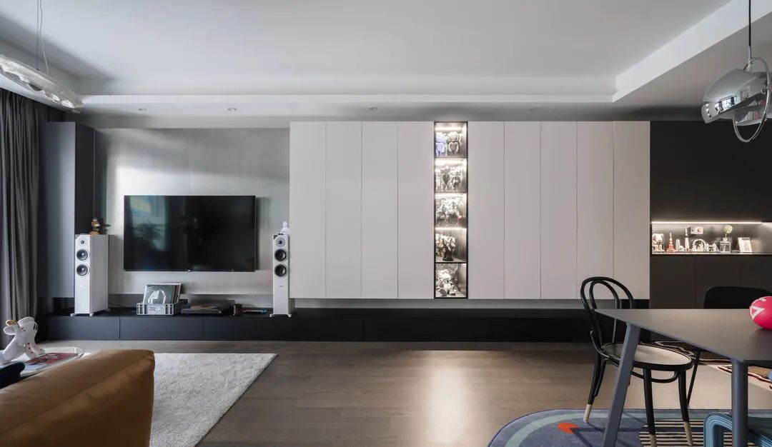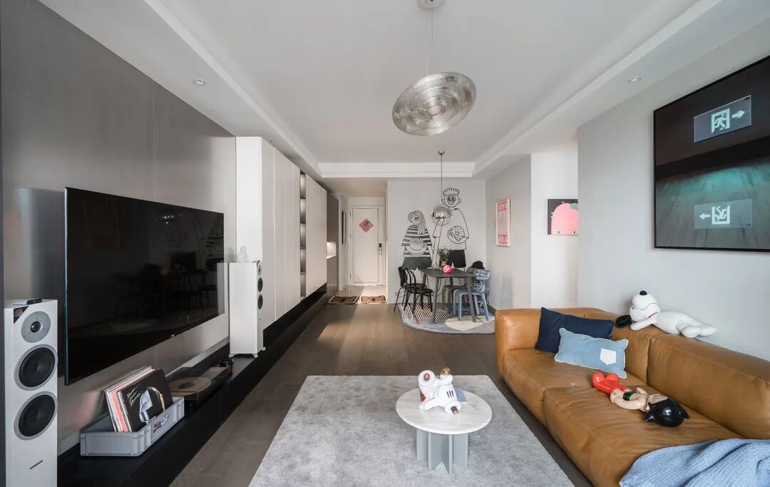 客厅,我们把电视墙做在了一开始开发商做沙发背景的位置,从玄关开始到阳台,做了一整排收纳,不仅好看还特别实用.柜子里面还藏了好多未开封的玩具公仔。