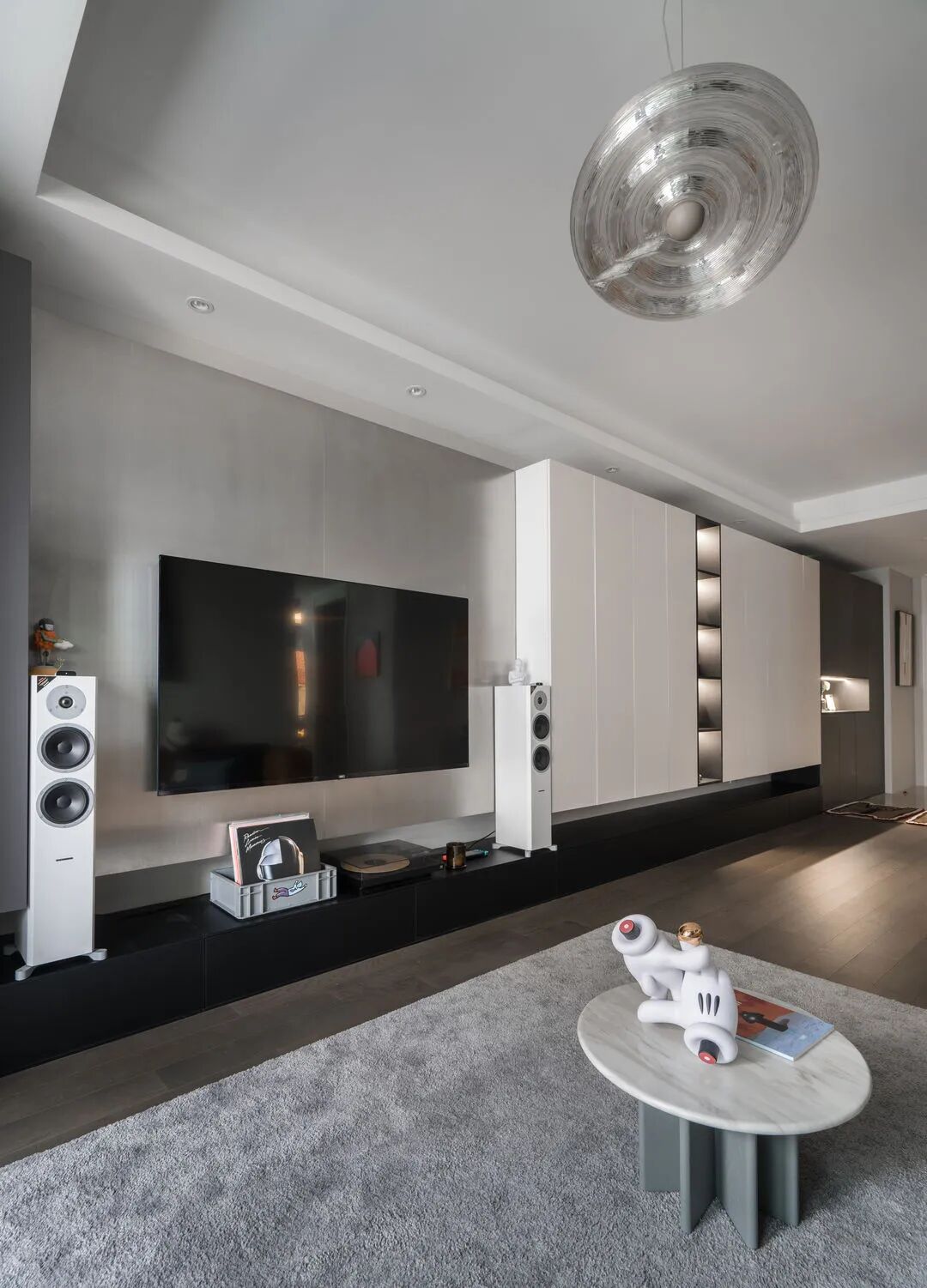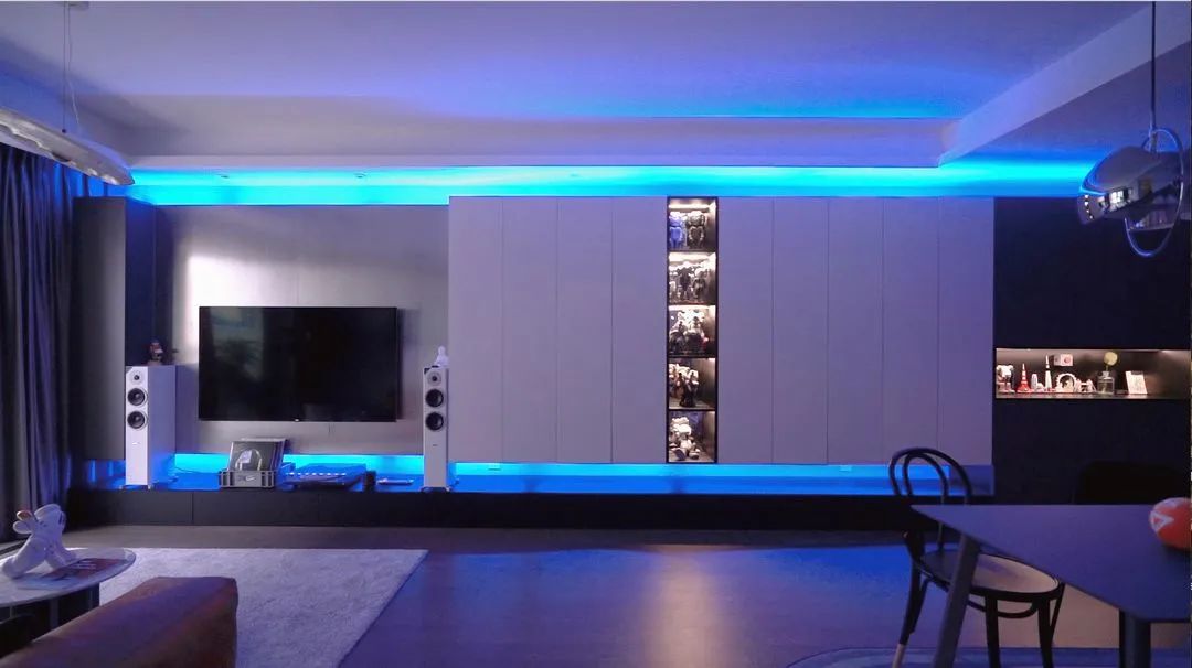 墙面柜体背后还藏了HUE变色灯带,特别酷,可以随着音乐来变色,在家开趴会很嗨~