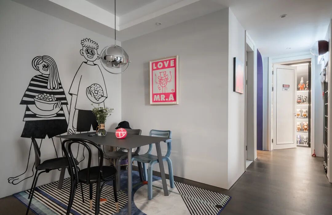 墙上的涂鸦是业主邀请了LALA company亲自画的.普及下插画艺术家. 插画艺术家Radio Woon LALA COMPANY 是Radio Woon自2004年开创的插画运动,创作灵感来自Radio喜欢的音乐、朋克文化以及虚伪的未来观,以黑色线条创造大眼睛与大肠嘴的人物。