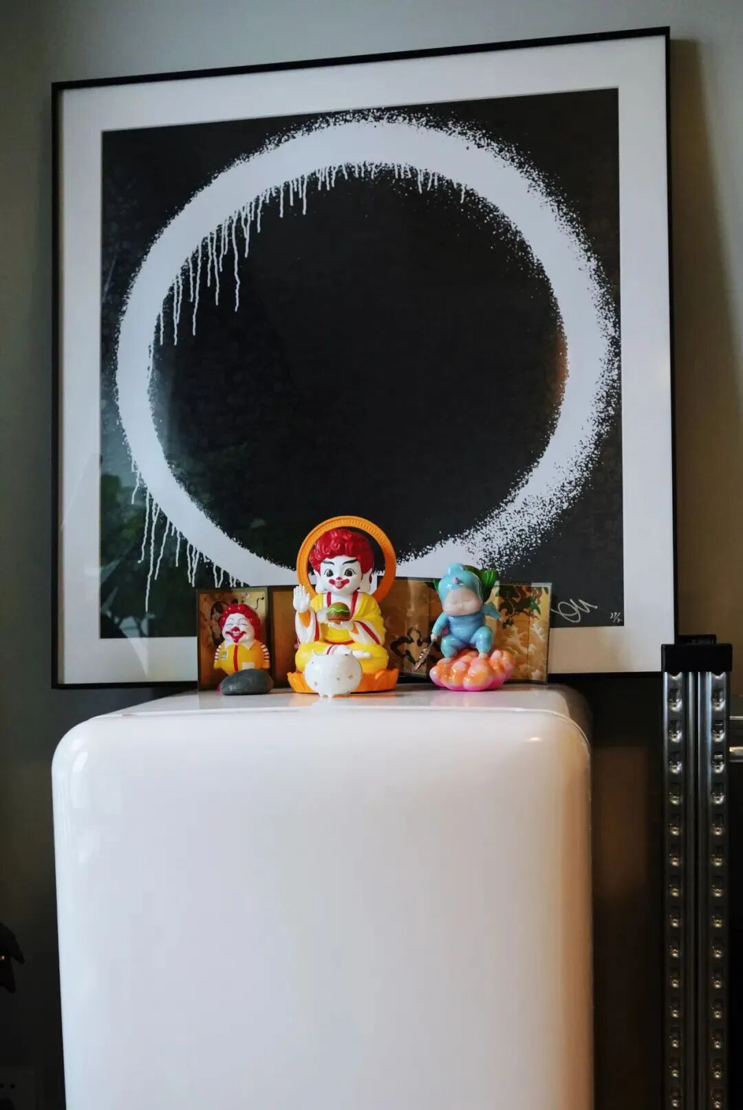 冰箱位置是佛龛,个人觉得特别好玩,村上隆的这副黑色装饰画特别好看。