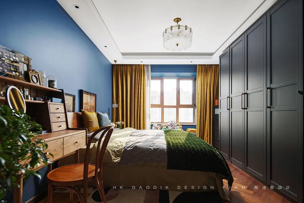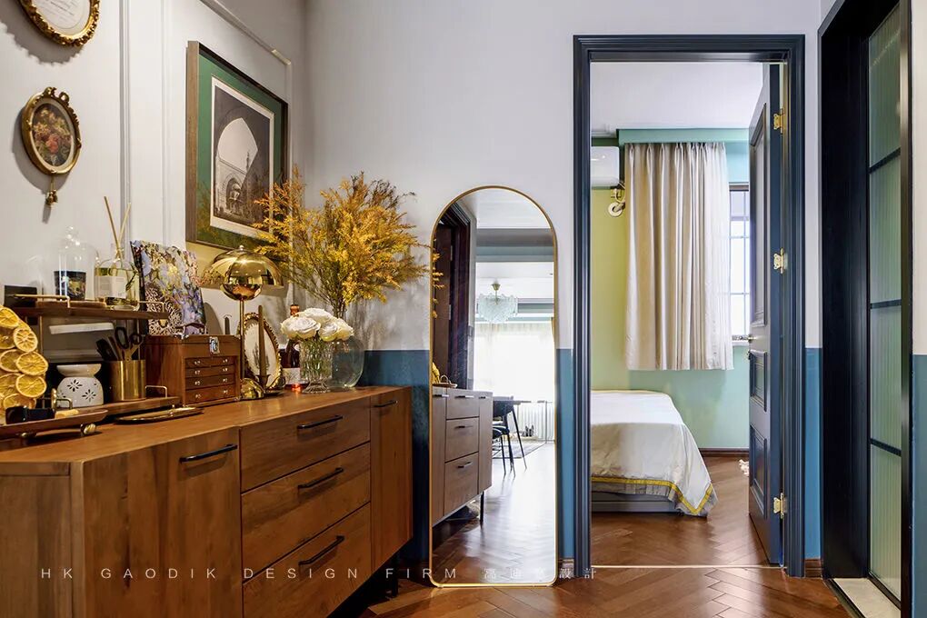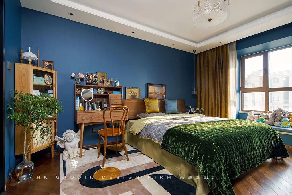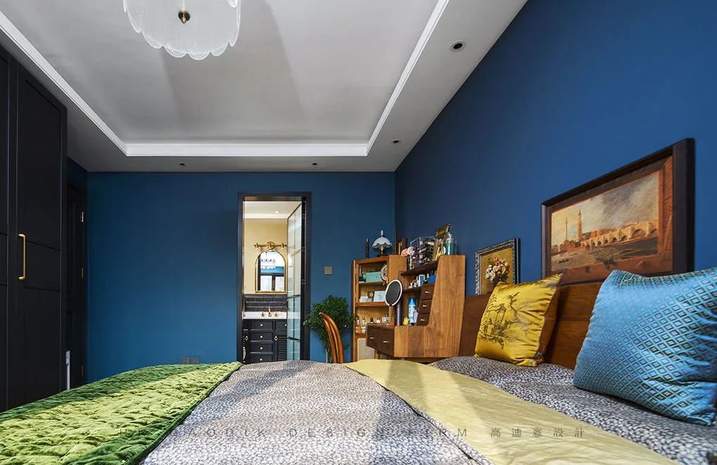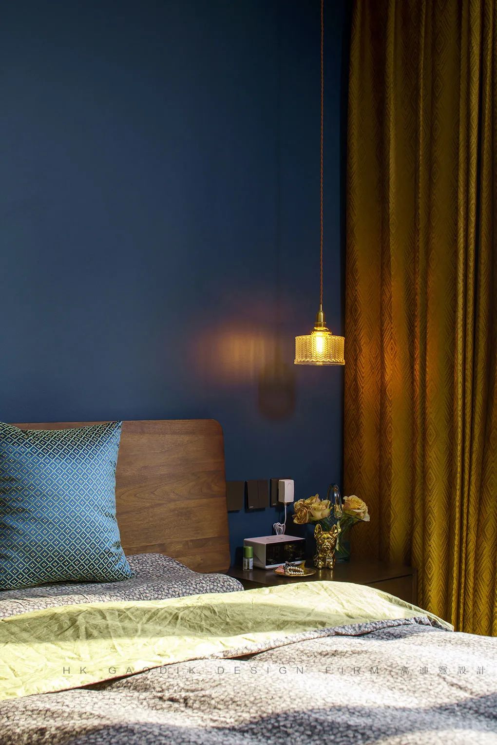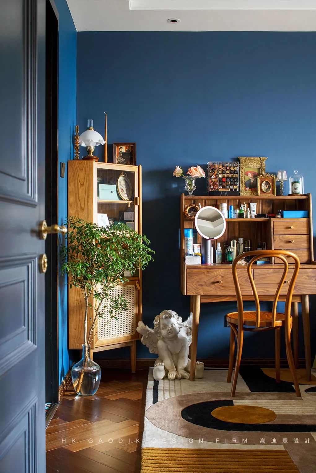 厨房只是换了老气的门板。另外门偏移十公分,在原来L型橱柜的基础上又加了一排40公分宽的边柜,增加储物空间。各种复古的小物件让空间更具趣味,保持了整体的质感基调。主卧底色相较于客厅更深一些,高饱和度的蓝、黄、墨绿组合让复古气息更加浓郁,原木色家具平衡深色带来的沉重感。金色与黑色的经典搭配,耐看且突显质感,地面花砖的的铺设又让空间多了一些跳跃感。