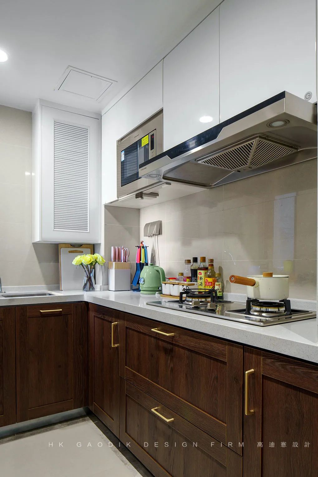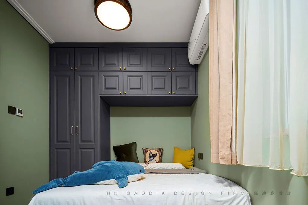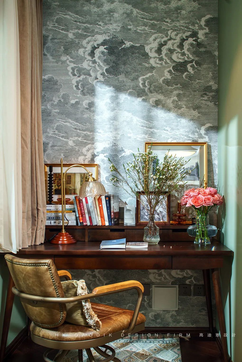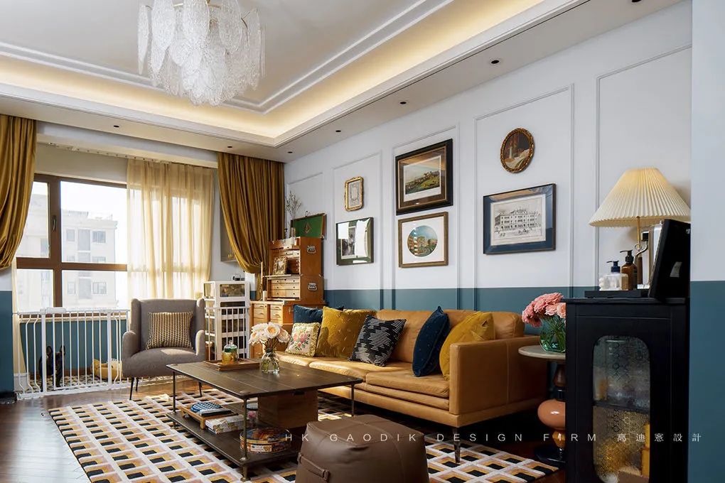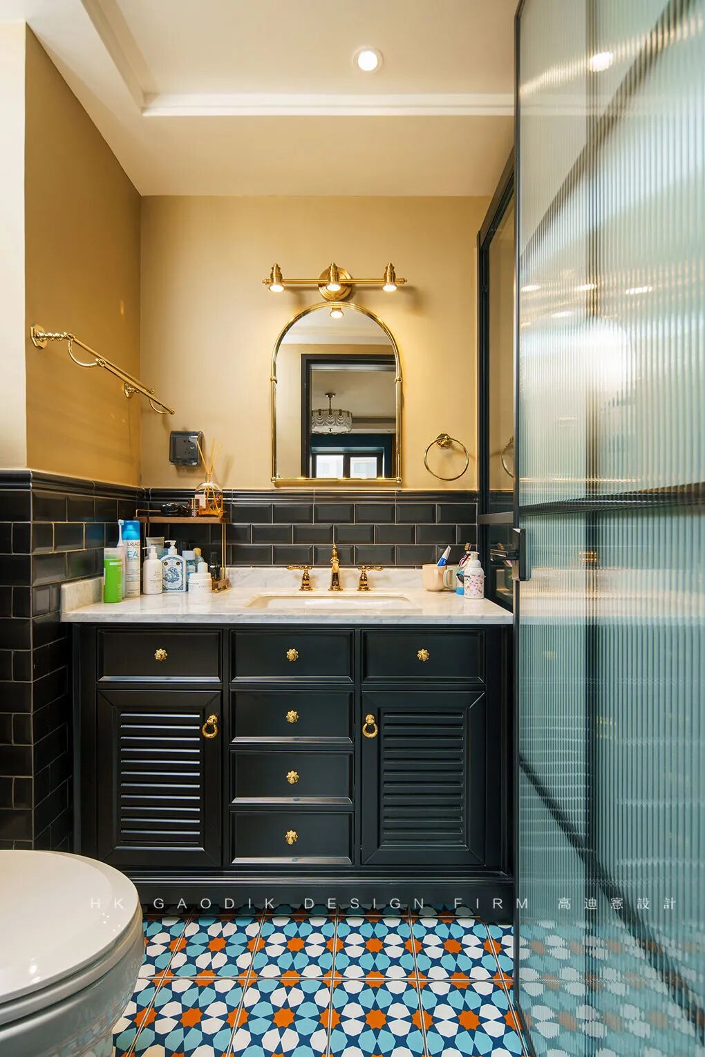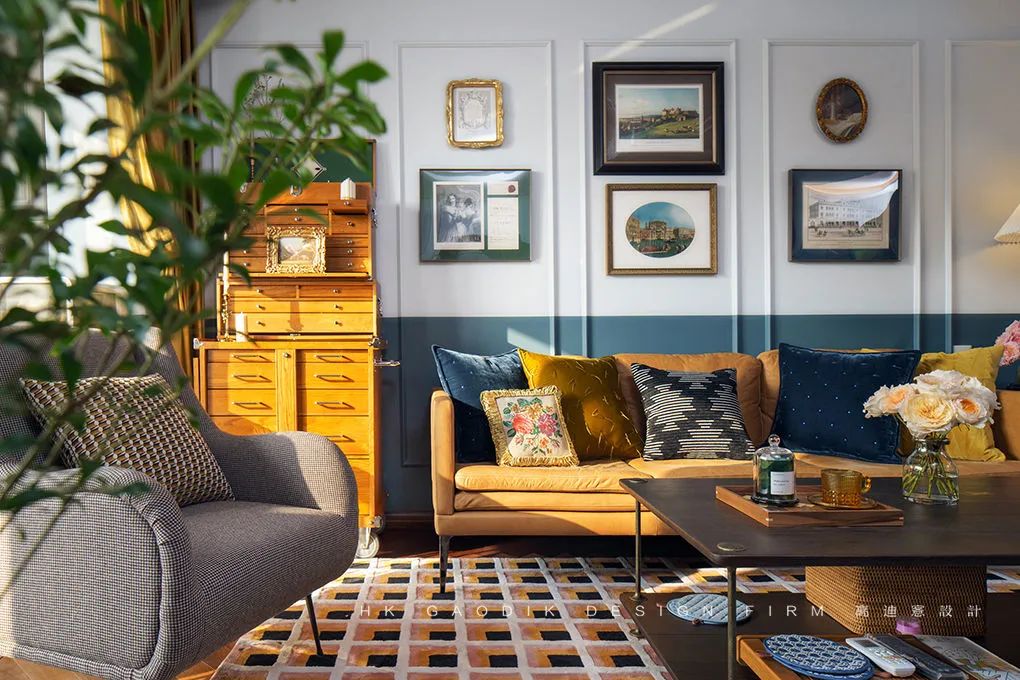 厨房只是换了老气的门板。另外门偏移十公分,在原来L型橱柜的基础上又加了一排40公分宽的边柜,增加储物空间。各种复古的小物件让空间更具趣味,保持了整体的质感基调。主卧底色相较于客厅更深一些,高饱和度的蓝、黄、墨绿组合让复古气息更加浓郁,原木色家具平衡深色带来的沉重感。金色与黑色的经典搭配,耐看且突显质感,地面花砖的的铺设又让空间多了一些跳跃感。