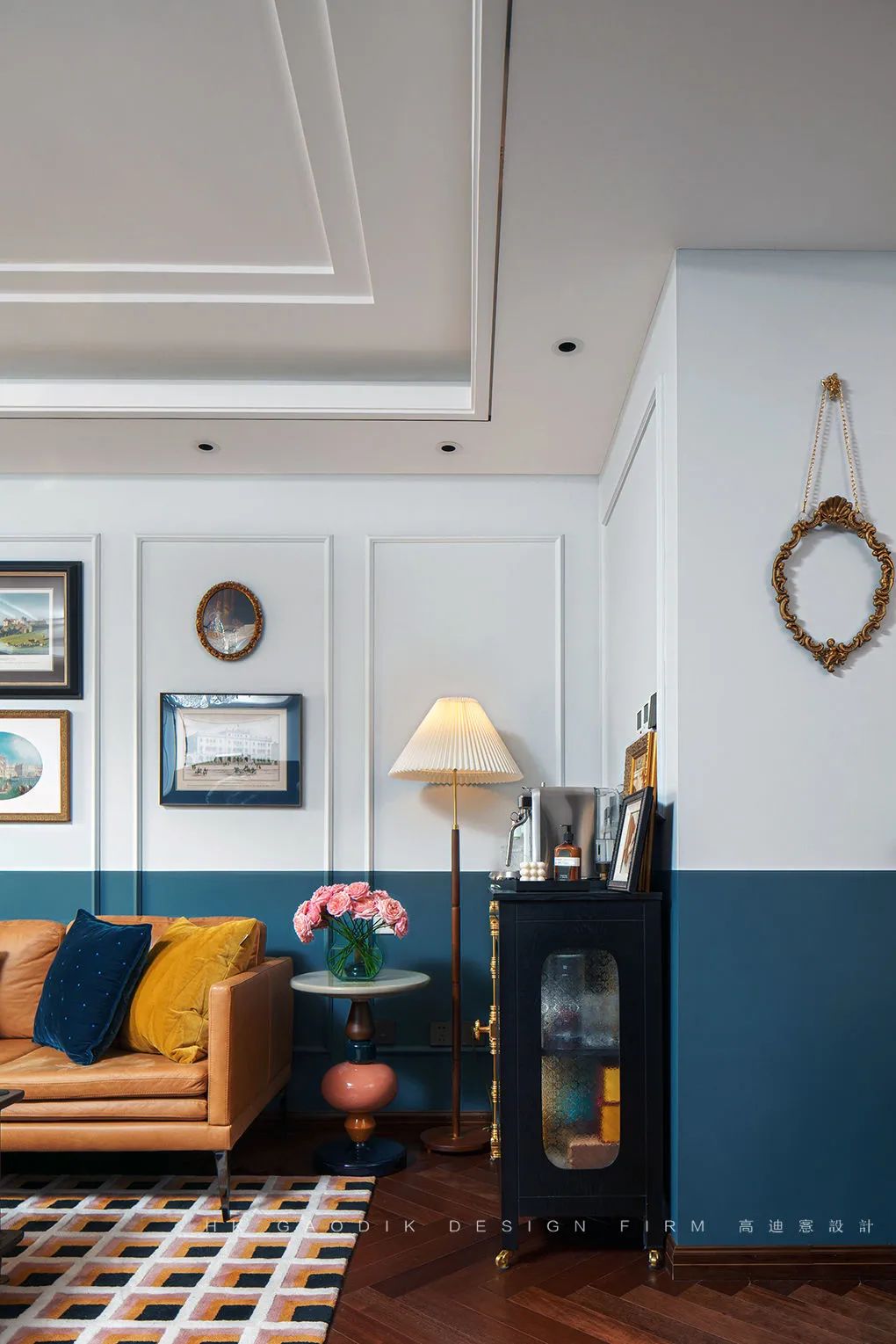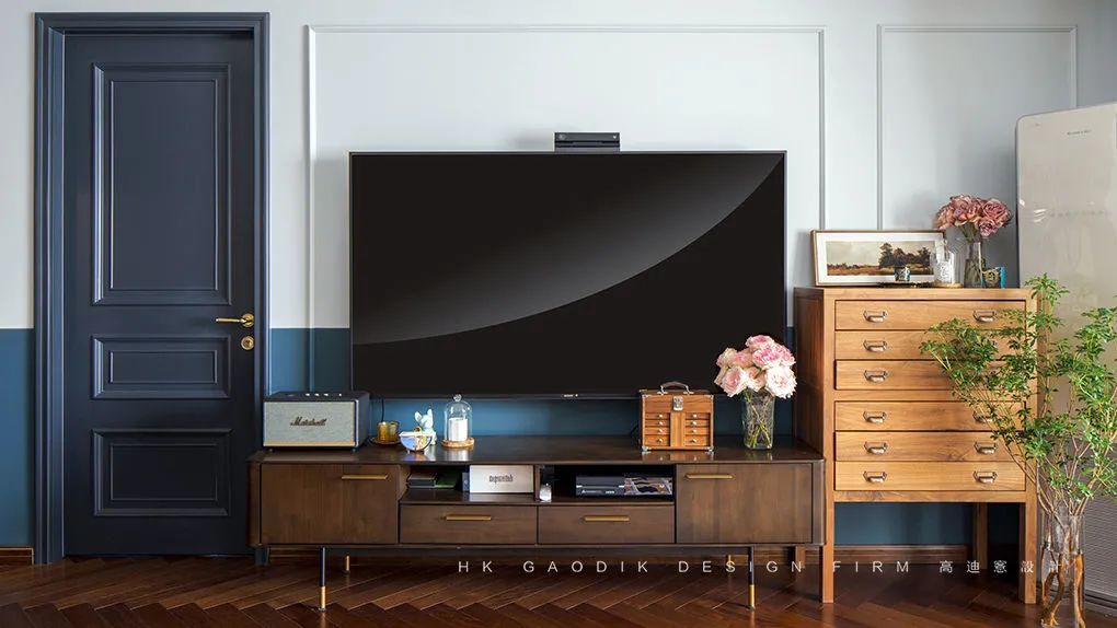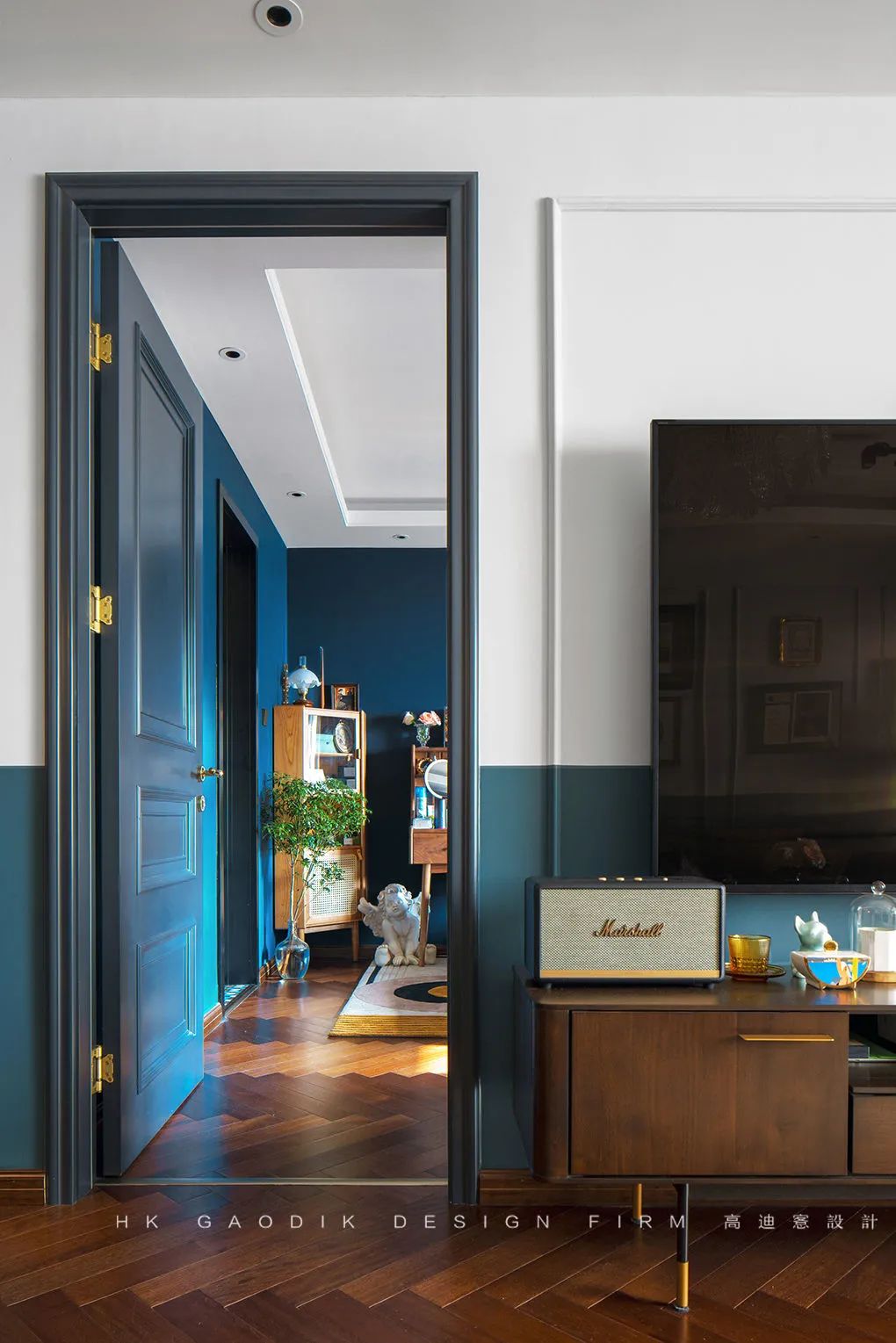 入户左手边成品矮柜,醇厚的木质感+拼接的半墙设计+配饰细节,在一开始便将整个家的基调铺垫,复古的精致感扑面而来。硬装改造上,保留了原先顶面造型,原有地暖不动,把大理石打掉,重新做找平铺设了木地板。墙面则根据设计全部铲掉,重新铺贴了石膏线。极浅的灰蓝与低饱和度的深蓝两种颜色拼接,显现出复古的韵味。装饰画、落地灯、边几、柜子,在这些细枝末节里隐藏的是不断积累,不断海淘的漫长过程,而不是一朝一夕事情。