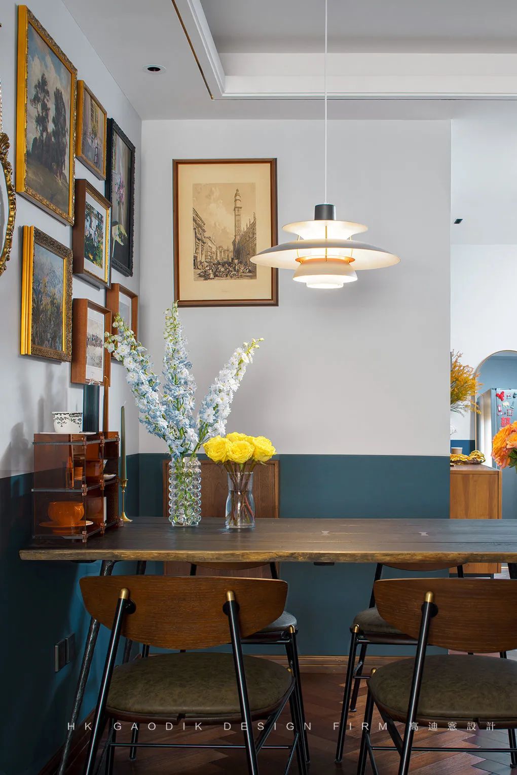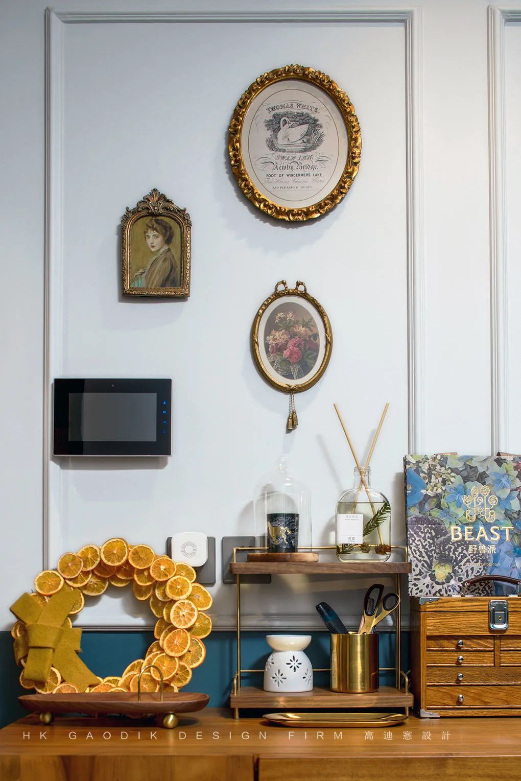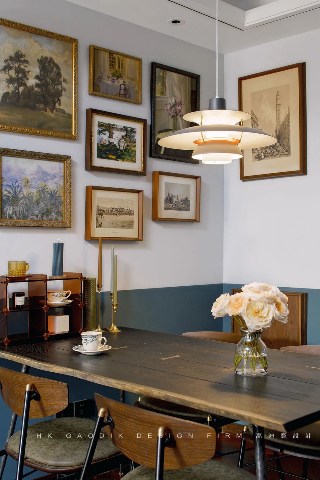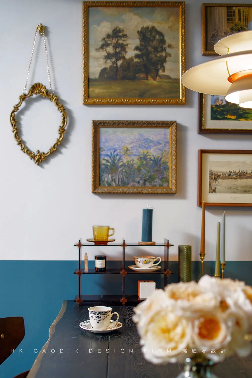 由手工艺工匠用的储物柜演变而来的这个装饰柜,足足等了好几个月才“落户”新家。更让人惊喜的是每天九十点的阳光总是悄然而至,带来一天的好心情。原先的白色木门统一更换成蓝色系门框与整体风格呼应,厨房、客卫则选用了长虹玻璃门,其独有的线条和通透感让空间更灵动轻松。复古的照片墙是本案的亮点,有繁复,有简约质朴,还有典雅的各式画框,错落有致,厚重和清新的组合,让整个餐厅区域既丰富又和谐。复古混搭的重中之重在于配饰的选择以及氛围的营造,精细到茶具、烛台、香薰都在发挥着微妙的平衡。